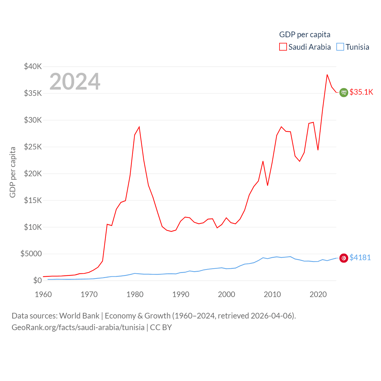 By GDP, Saudi Arabia ranks 18/197 ($1.24T) and Tunisia ranks 93/197 ($51.3B). By GDP per capita, Saudi Arabia ranks 33/197 ($35,122), while Tunisia ranks 129/197 ($4,181).