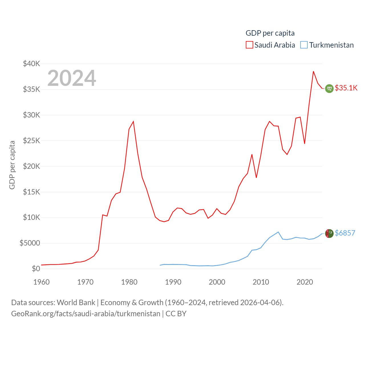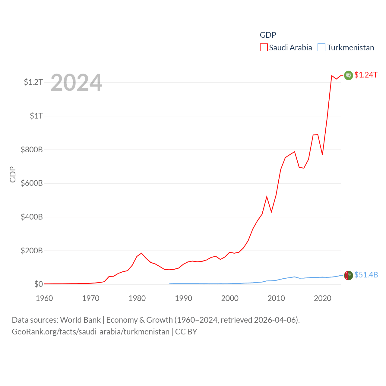 By GDP, Saudi Arabia ranks 18/197 ($1.24T) and Turkmenistan ranks 92/197 ($51.4B). By GDP per capita, Saudi Arabia ranks 33/197 ($35,122), while Turkmenistan ranks 104/197 ($6,857).
