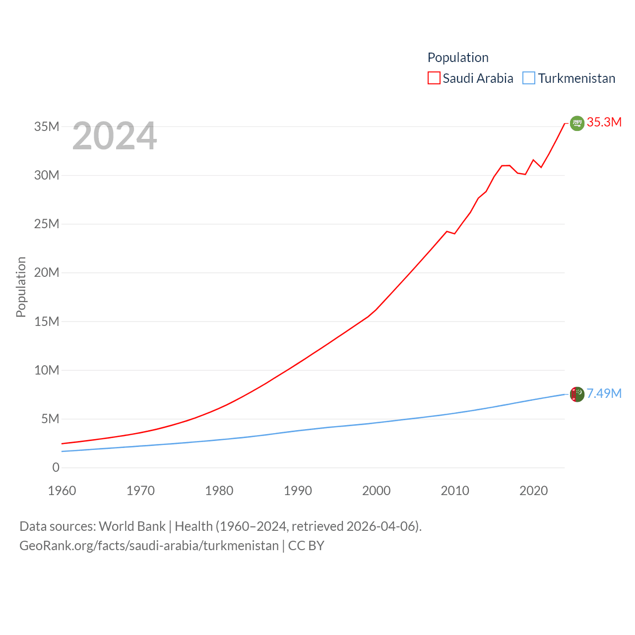 Saudi Arabia has a population of 35.3M (ranked 45/197), compared with 7.49M in Turkmenistan (ranked 104/197). Saudi Arabia's land area is 830,000 sq mi versus 181,441 sq mi for Turkmenistan (ranked 12th vs. 53rd).