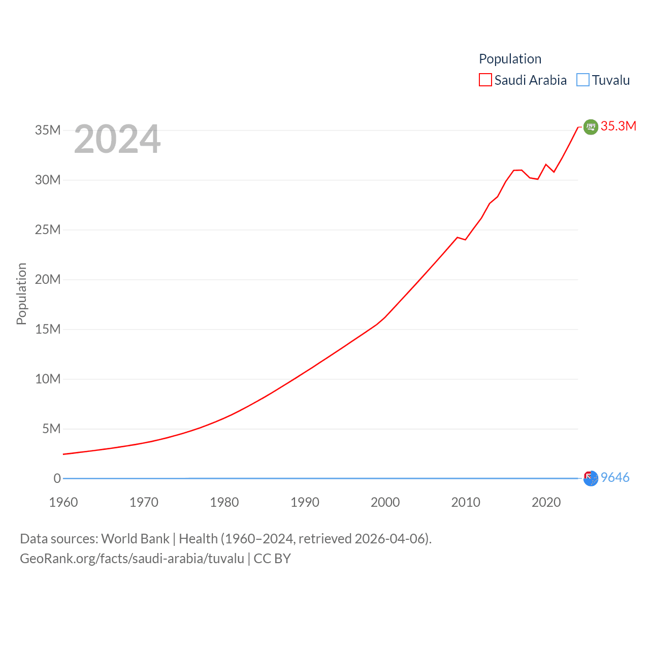 Saudi Arabia has a population of 35.3M (ranked 45/197), compared with 9.65K in Tuvalu (ranked 196/197). Saudi Arabia's land area is 830,000 sq mi versus 11.6 sq mi for Tuvalu (ranked 12th vs. 194th).