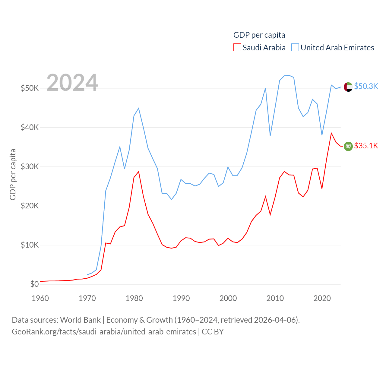 By GDP, Saudi Arabia ranks 18/197 ($1.24T) and The United Arab Emirates ranks 27/197 ($552B). By GDP per capita, Saudi Arabia ranks 33/197 ($35,122), while The United Arab Emirates ranks 24/197 ($50,274).