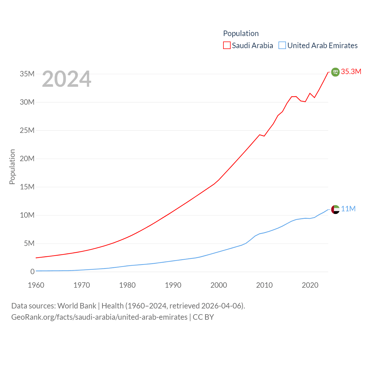 Saudi Arabia has a population of 35.3M (ranked 45/197), compared with 11M in The United Arab Emirates (ranked 86/197). Saudi Arabia's land area is 830,000 sq mi versus 27,421 sq mi for The United Arab Emirates (ranked 12th vs. 117th).