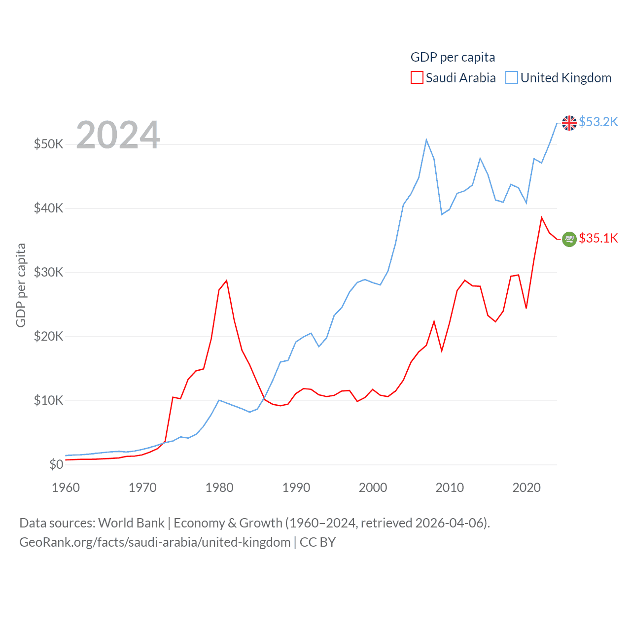 By GDP, Saudi Arabia ranks 18/197 ($1.24T) and The United Kingdom ranks 6/197 ($3.69T). By GDP per capita, Saudi Arabia ranks 33/197 ($35,122), while The United Kingdom ranks 22/197 ($53,246).