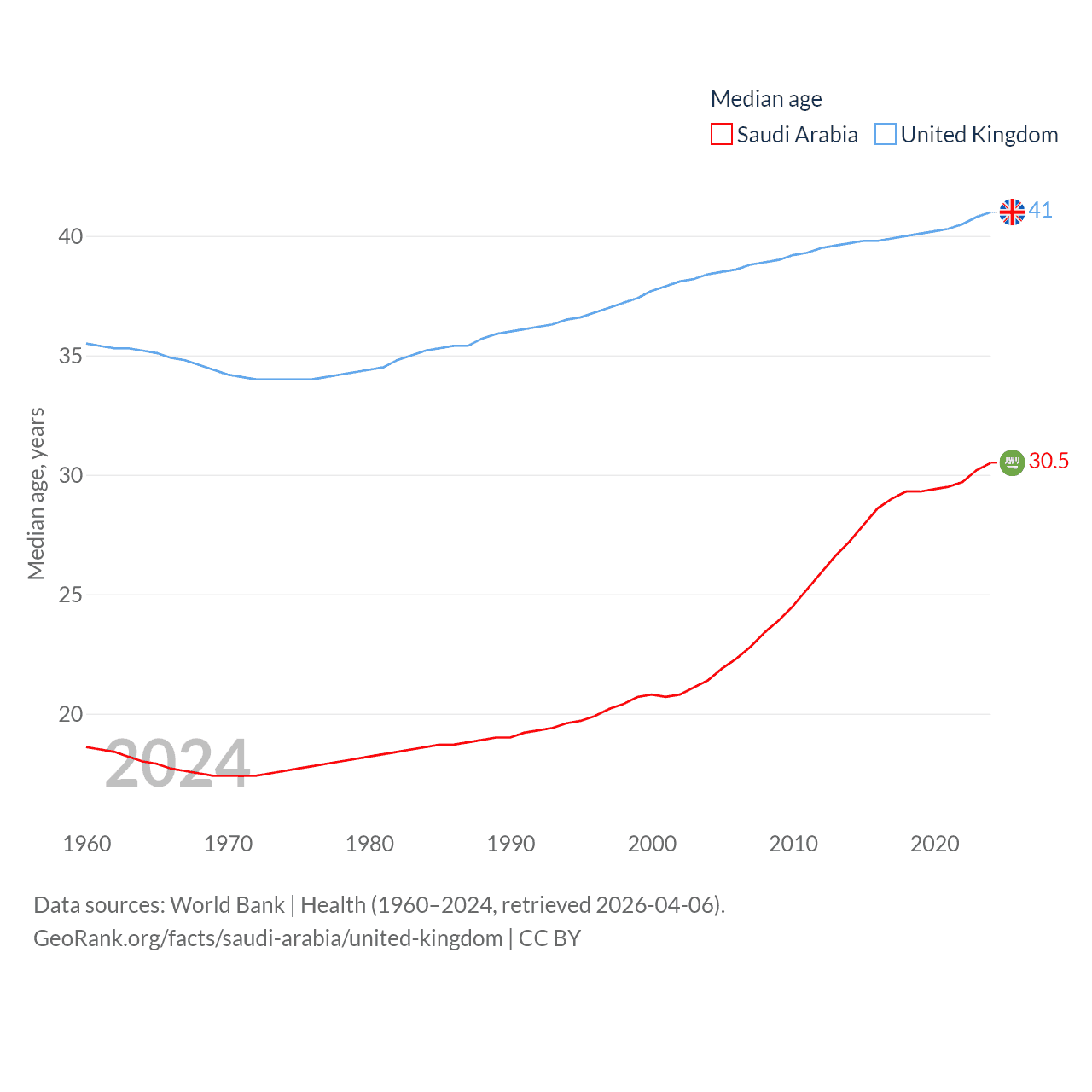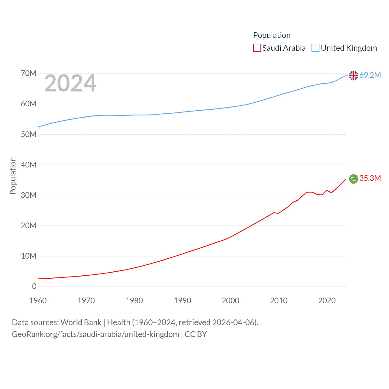 Saudi Arabia has a population of 35.3M (ranked 45/197), compared with 69.2M in The United Kingdom (ranked 21/197). Saudi Arabia's land area is 830,000 sq mi versus 93,410 sq mi for The United Kingdom (ranked 12th vs. 78th).