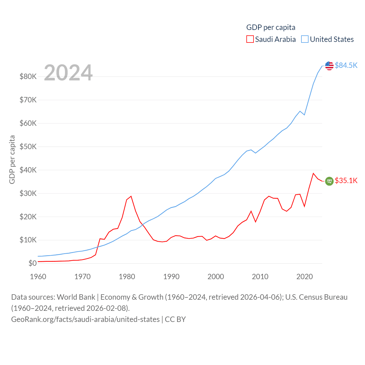 By GDP, Saudi Arabia ranks 18/197 ($1.24T) and The United States ranks 1/197 ($28.8T). By GDP per capita, Saudi Arabia ranks 33/197 ($35,122), while The United States ranks 10/197 ($84,534).