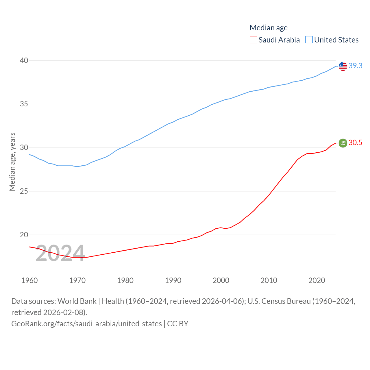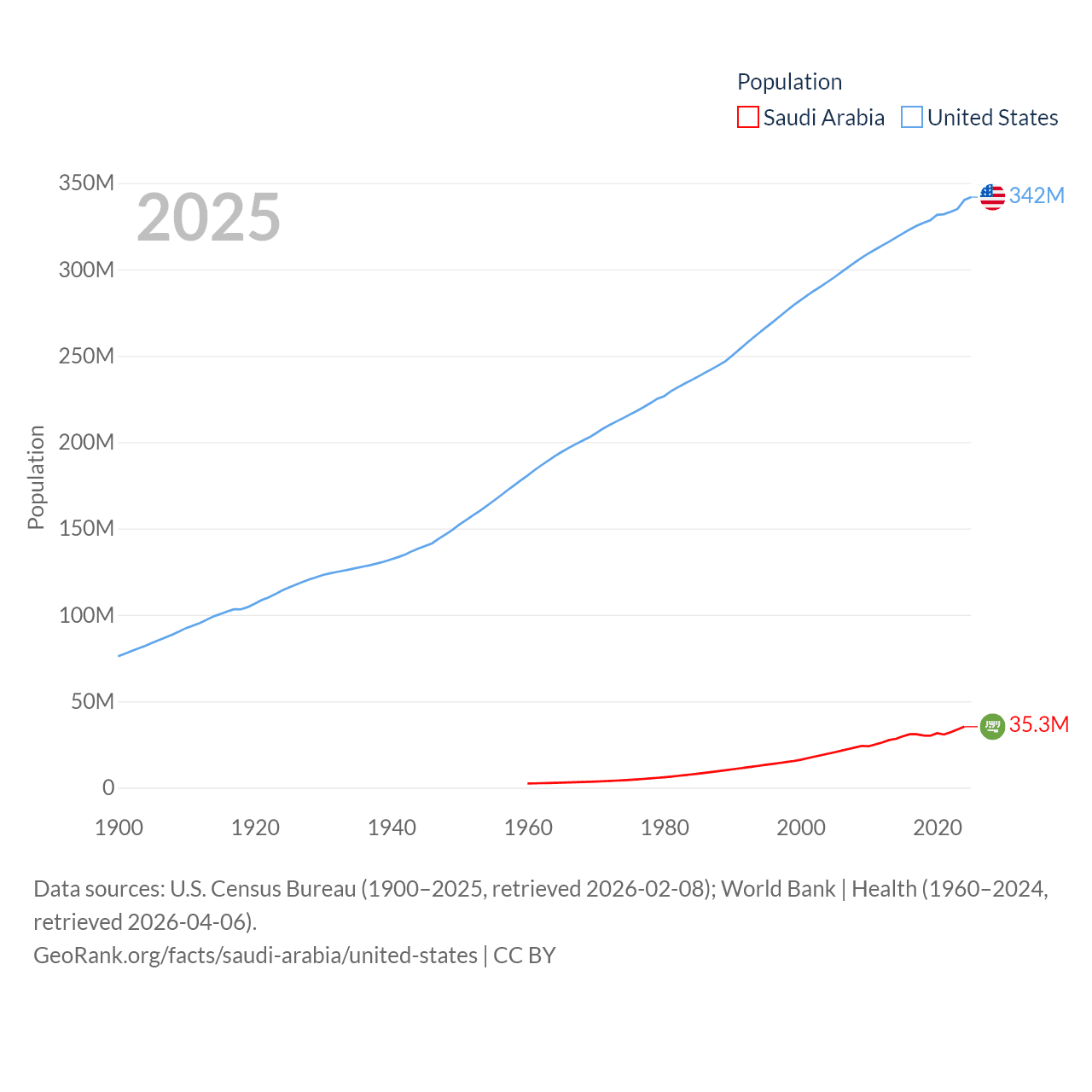 Saudi Arabia has a population of 35.3M (ranked 45/197), compared with 342M in The United States (ranked 3/197). Saudi Arabia's land area is 830,000 sq mi versus 3,531,839 sq mi for The United States (ranked 12th vs. 3rd).
