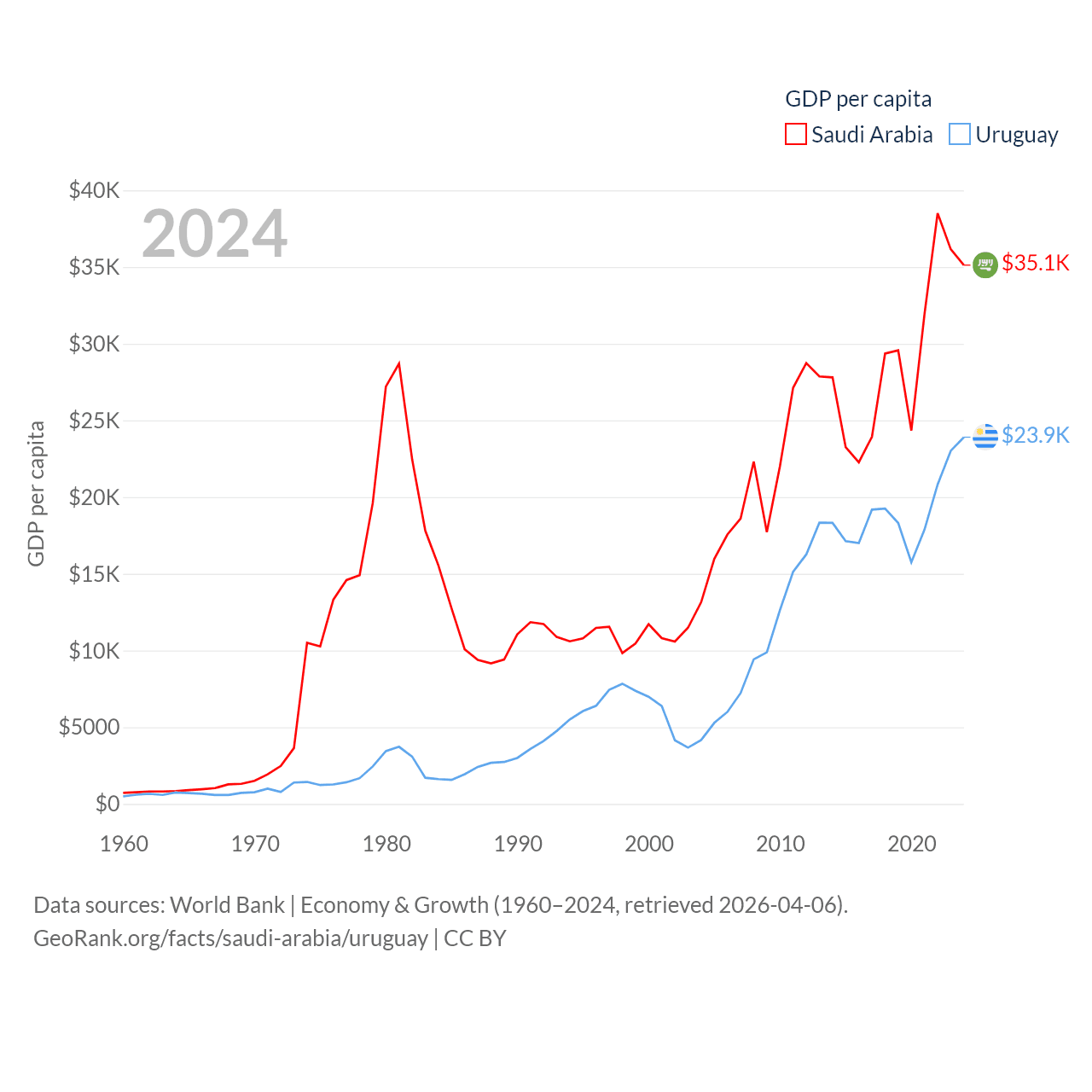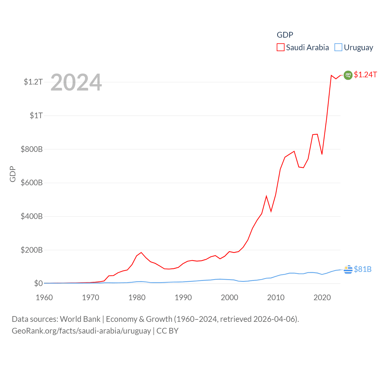 By GDP, Saudi Arabia ranks 18/197 ($1.24T) and Uruguay ranks 81/197 ($81B). By GDP per capita, Saudi Arabia ranks 33/197 ($35,122), while Uruguay ranks 52/197 ($23,907).