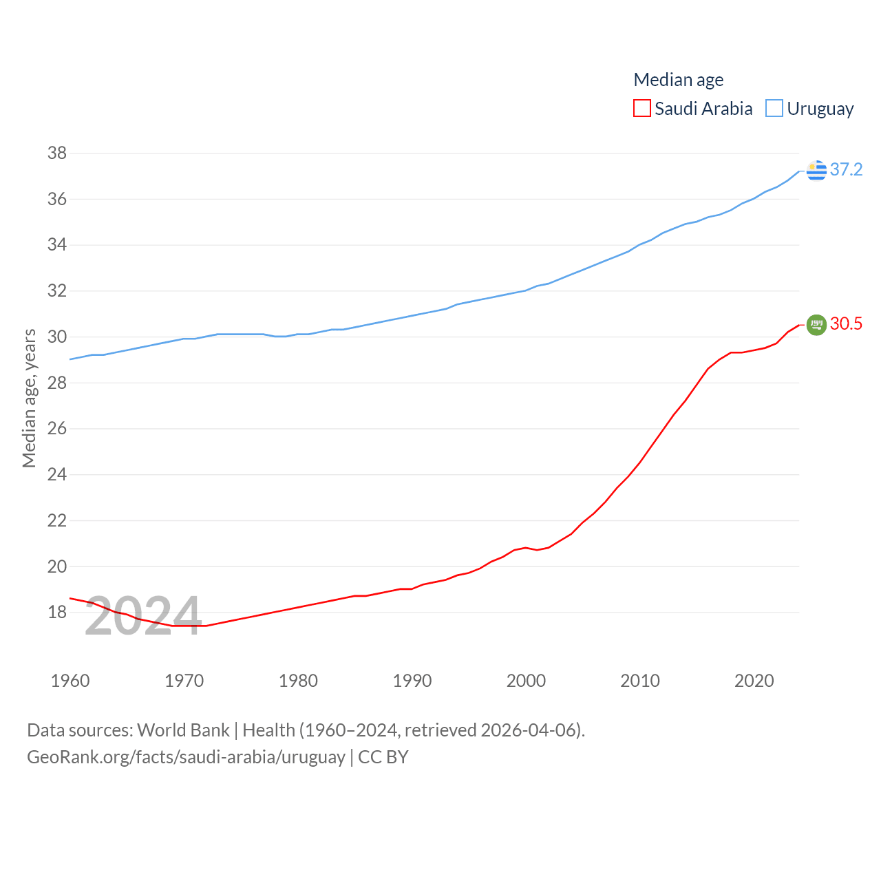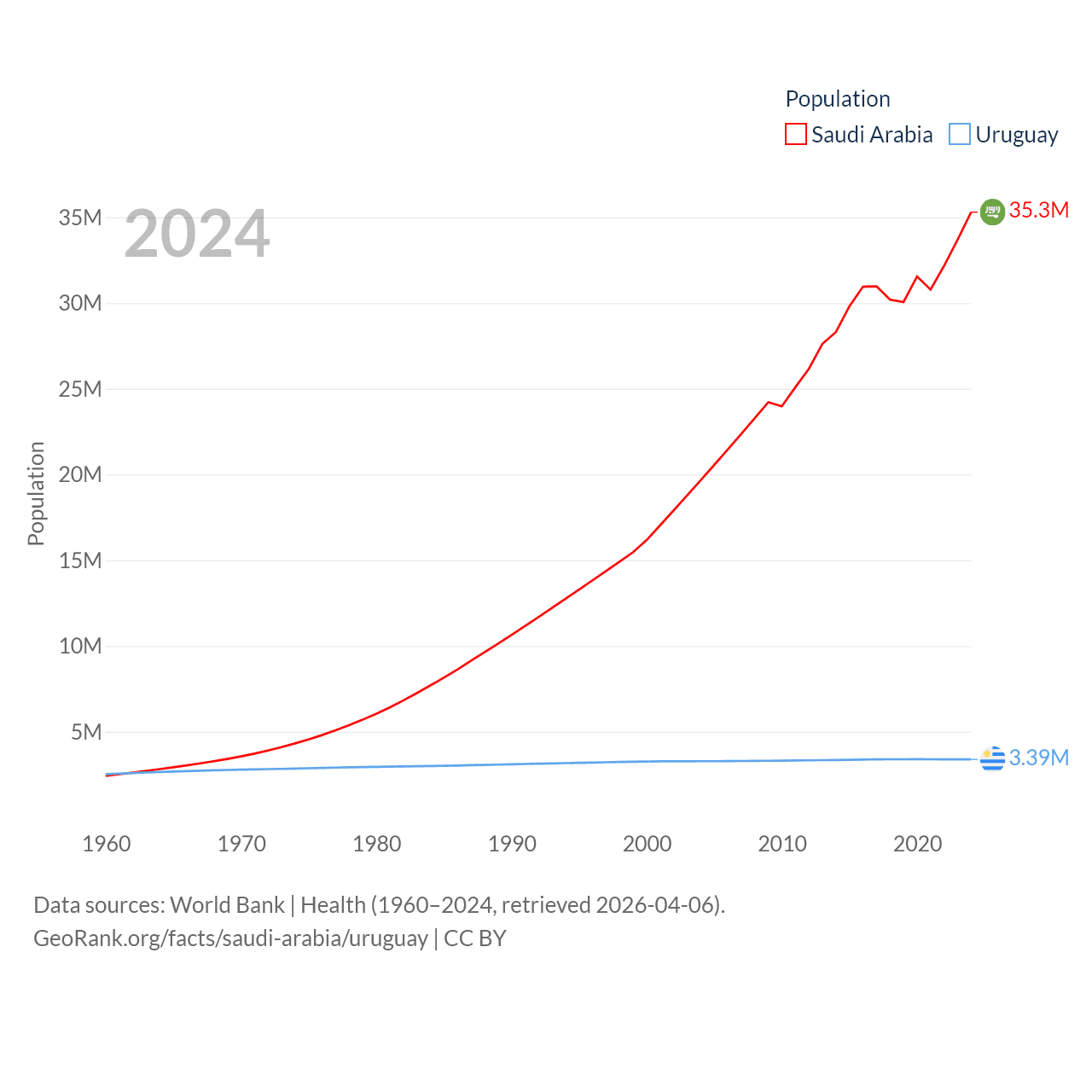 Saudi Arabia has a population of 35.3M (ranked 45/197), compared with 3.39M in Uruguay (ranked 133/197). Saudi Arabia's land area is 830,000 sq mi versus 67,576 sq mi for Uruguay (ranked 12th vs. 89th).