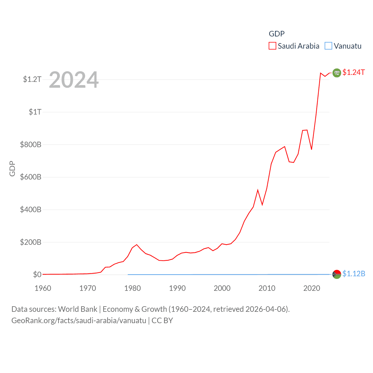 By GDP, Saudi Arabia ranks 18/197 ($1.24T) and Vanuatu ranks 188/197 ($1.12B). By GDP per capita, Saudi Arabia ranks 33/197 ($35,122), while Vanuatu ranks 137/197 ($3,411).