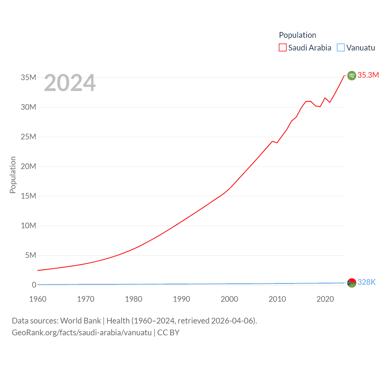 Saudi Arabia has a population of 35.3M (ranked 45/197), compared with 328K in Vanuatu (ranked 174/197). Saudi Arabia's land area is 830,000 sq mi versus 4,707 sq mi for Vanuatu (ranked 12th vs. 157th).