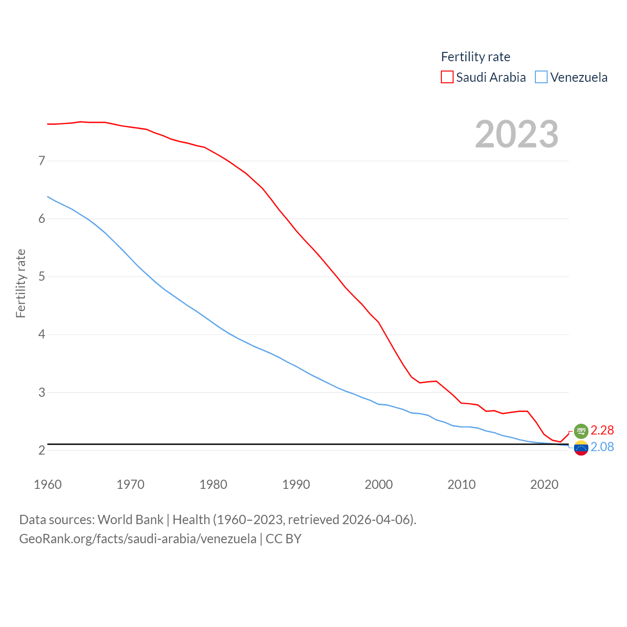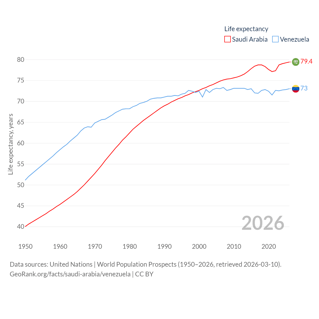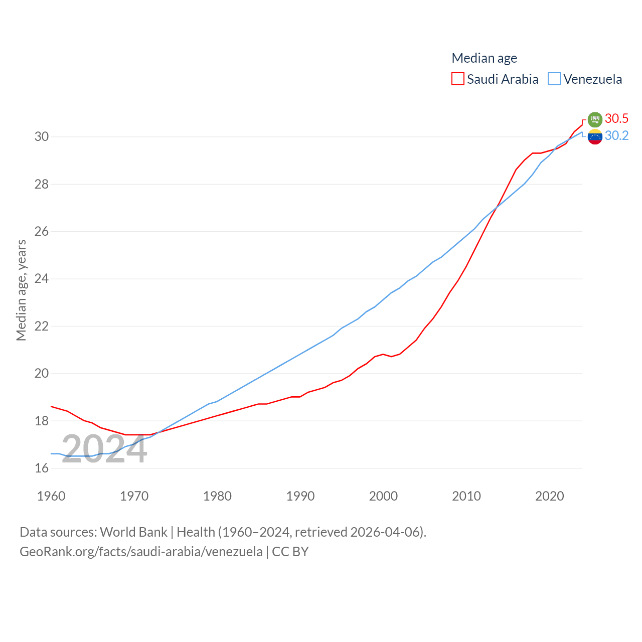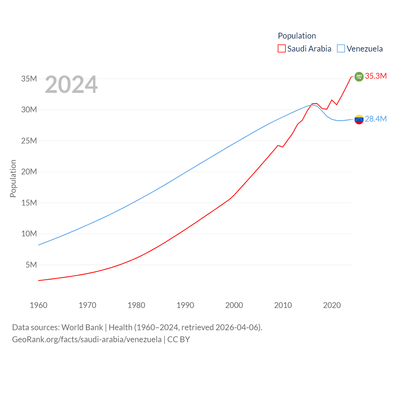 Saudi Arabia has a population of 35.3M (ranked 45/197), compared with 28.4M in Venezuela (ranked 53/197). Saudi Arabia's land area is 830,000 sq mi versus 340,561 sq mi for Venezuela (ranked 12th vs. 32nd).