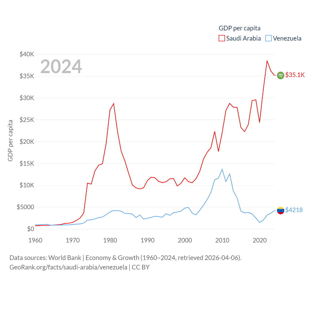 By GDP, Saudi Arabia ranks 18/197 ($1.24T) and Venezuela ranks 65/197 ($120B). By GDP per capita, Saudi Arabia ranks 33/197 ($35,122), while Venezuela ranks 128/197 ($4,218).