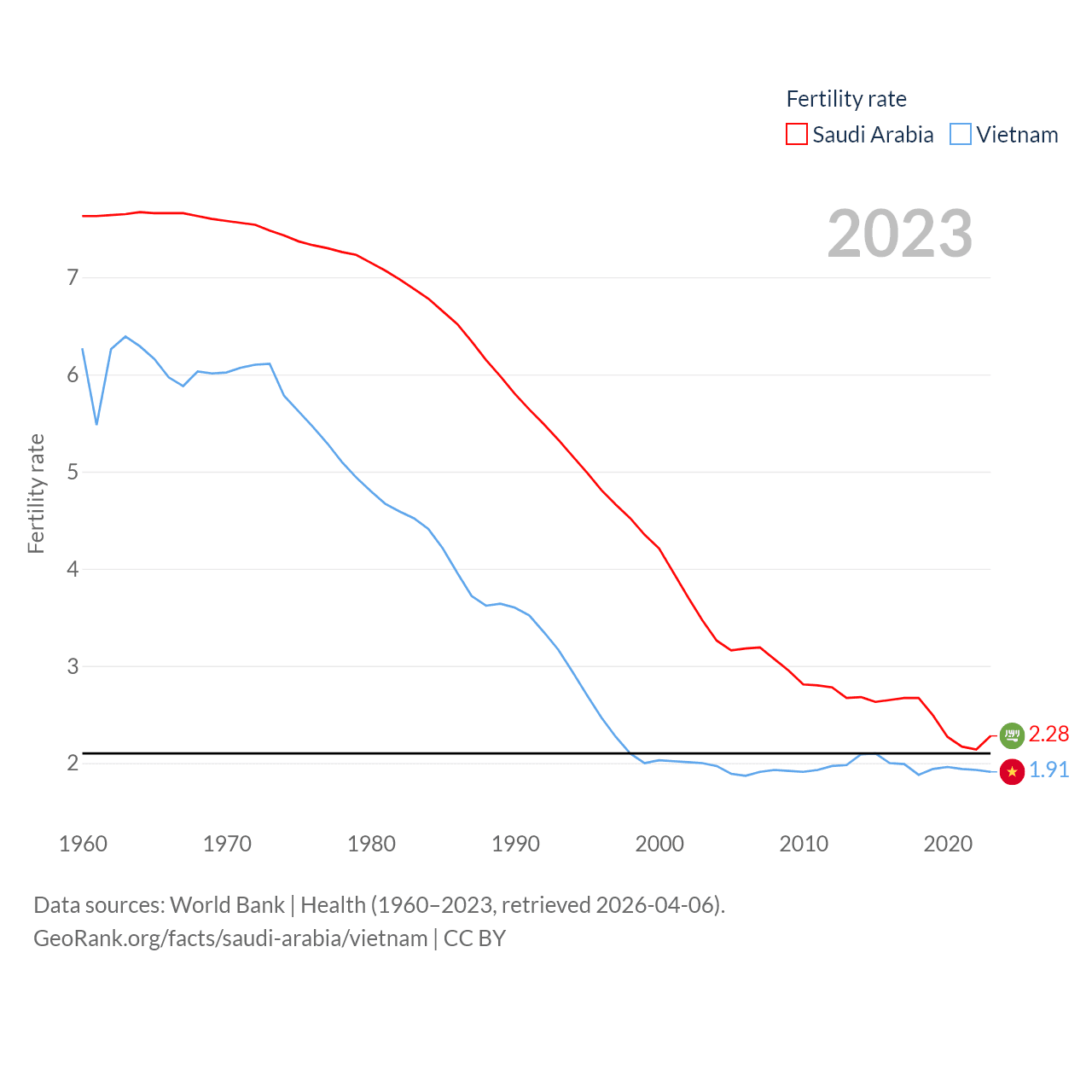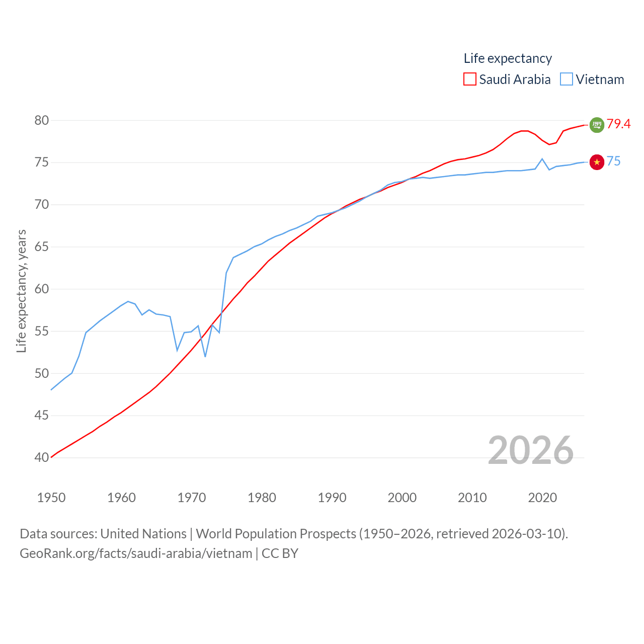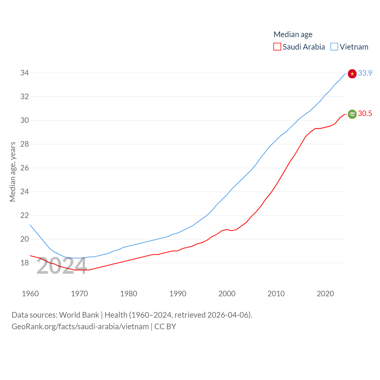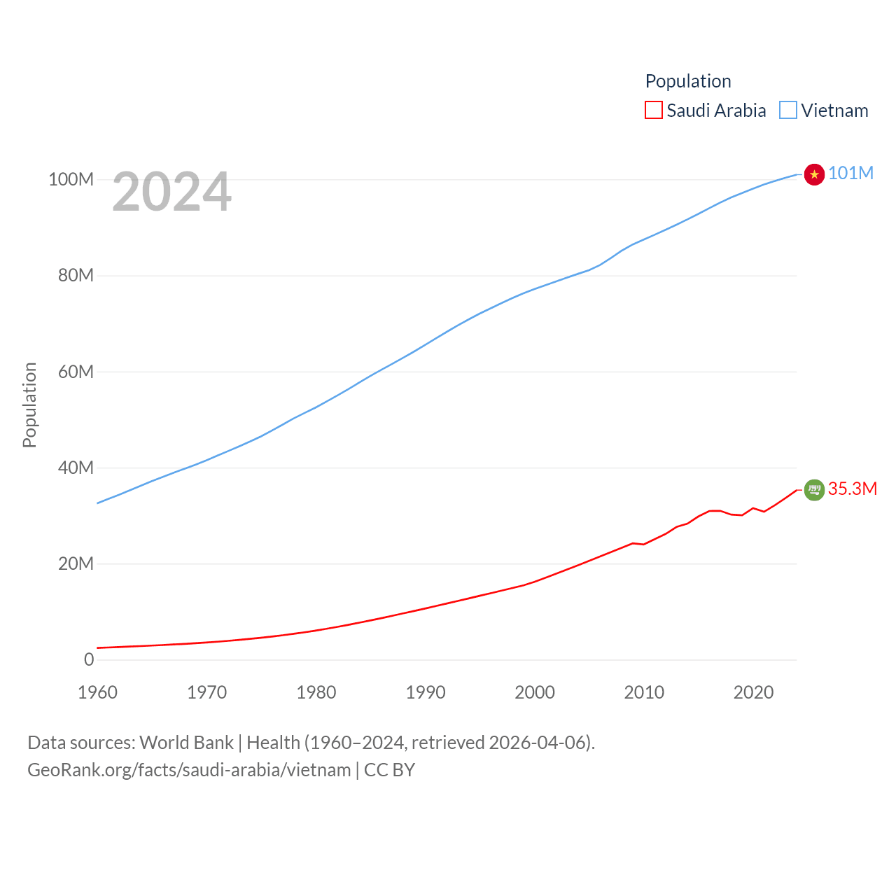 Saudi Arabia has a population of 35.3M (ranked 45/197), compared with 101M in Vietnam (ranked 16/197). Saudi Arabia's land area is 830,000 sq mi versus 121,016 sq mi for Vietnam (ranked 12th vs. 67th).
