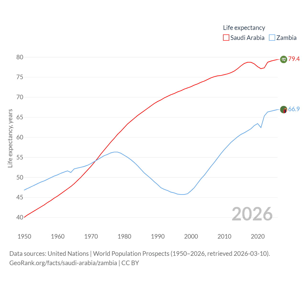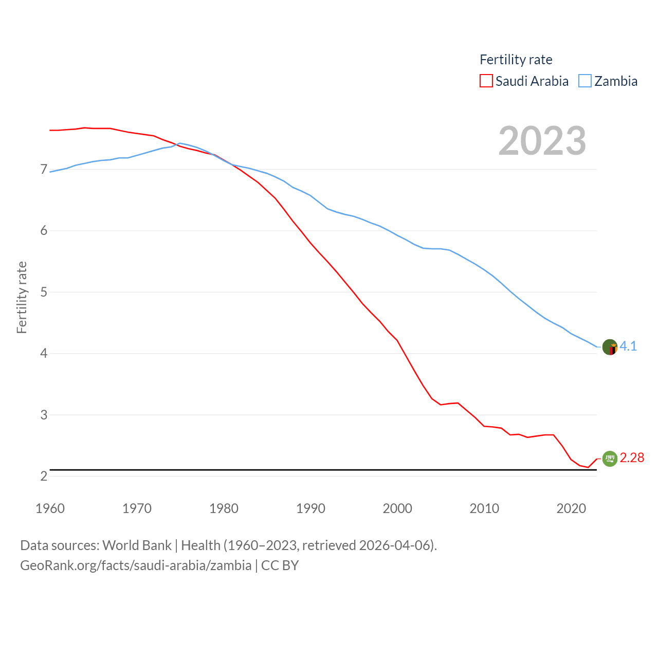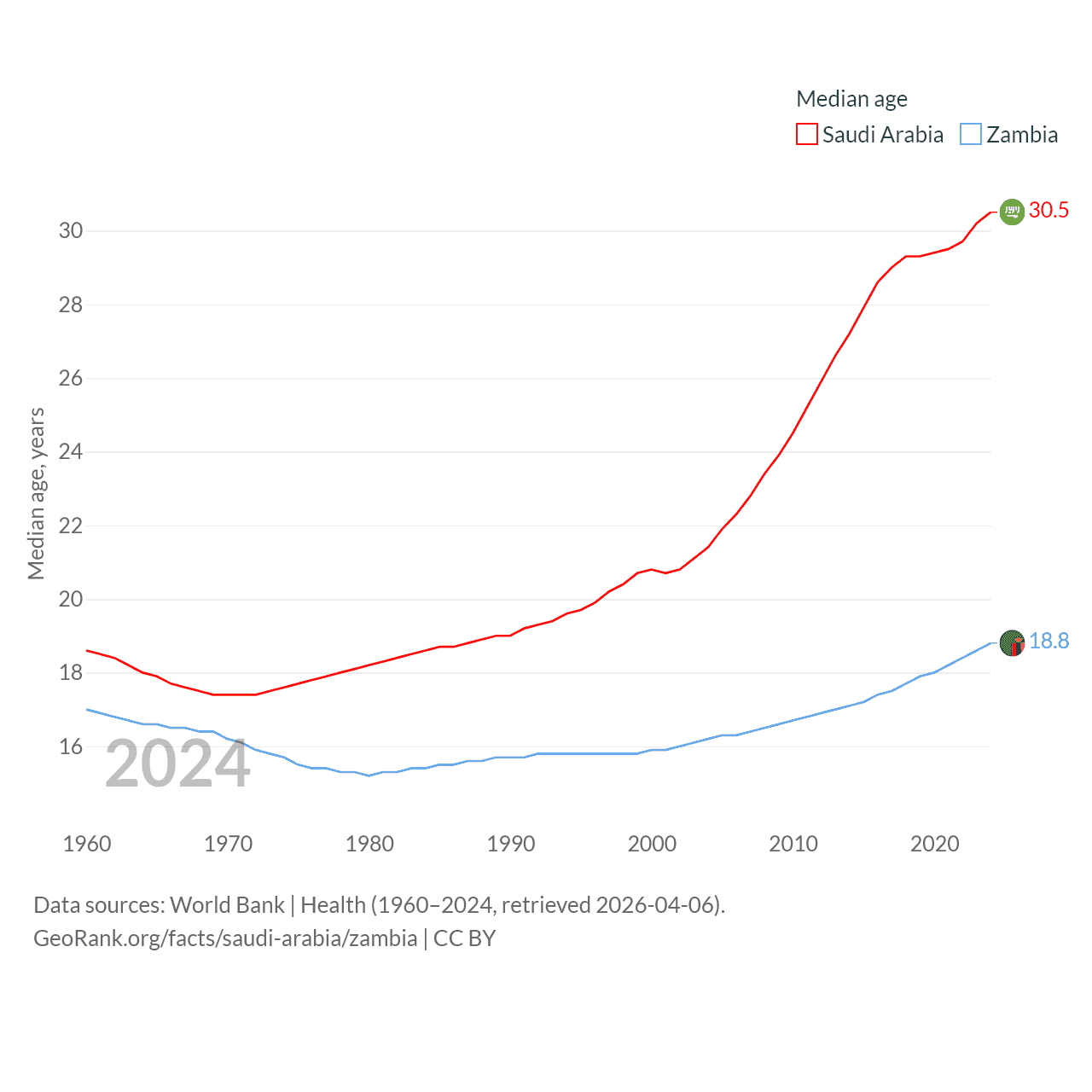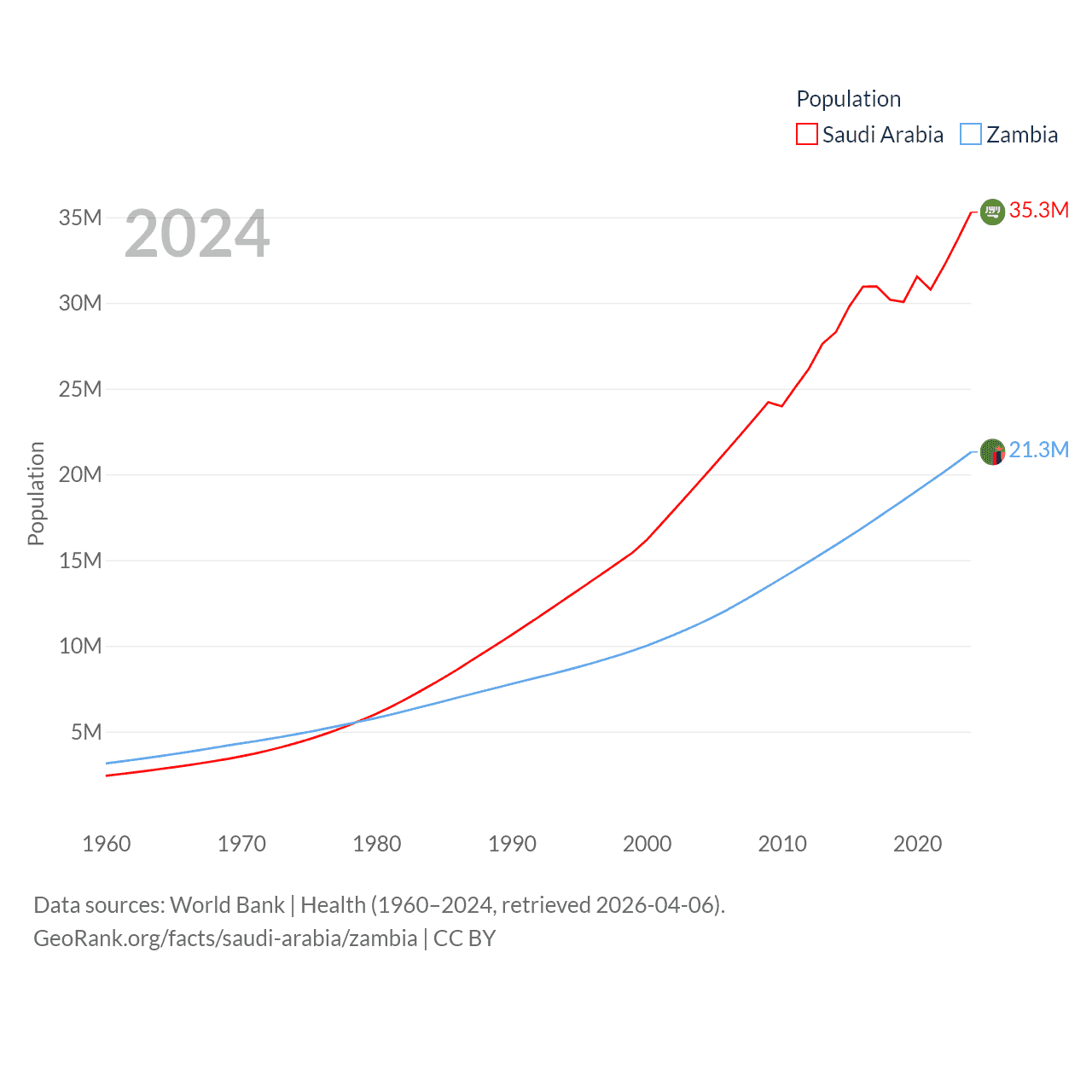 Saudi Arabia has a population of 35.3M (ranked 45/197), compared with 21.3M in Zambia (ranked 63/197). Saudi Arabia's land area is 830,000 sq mi versus 287,024 sq mi for Zambia (ranked 12th vs. 37th).