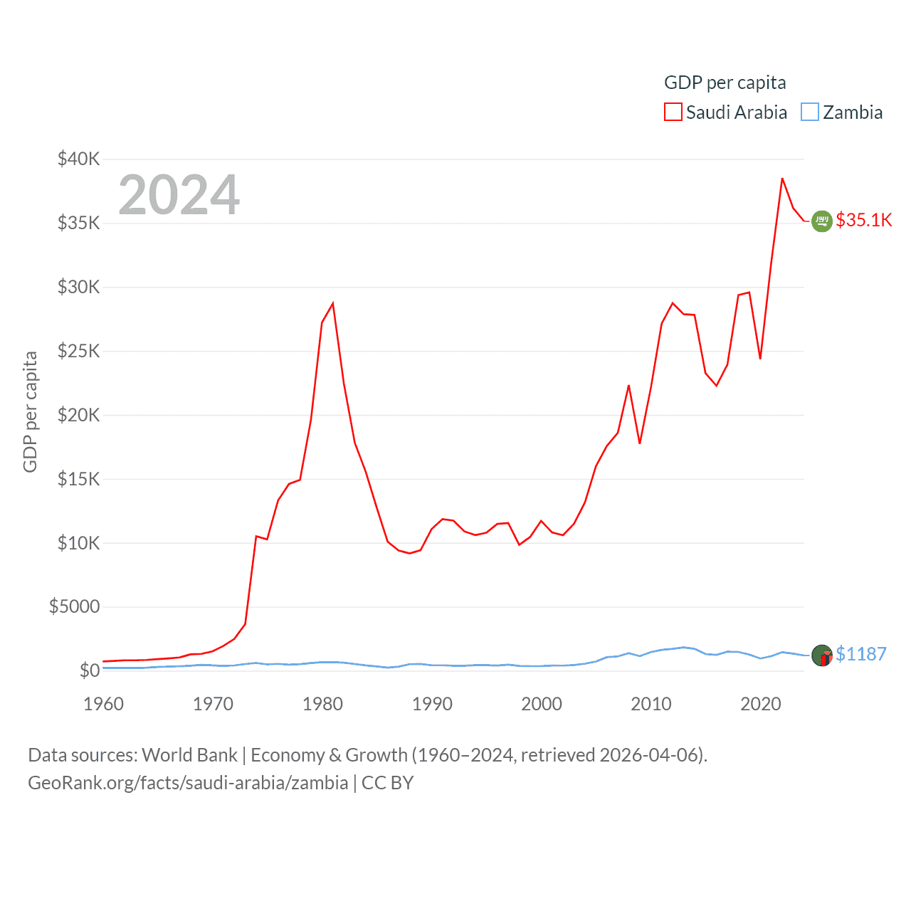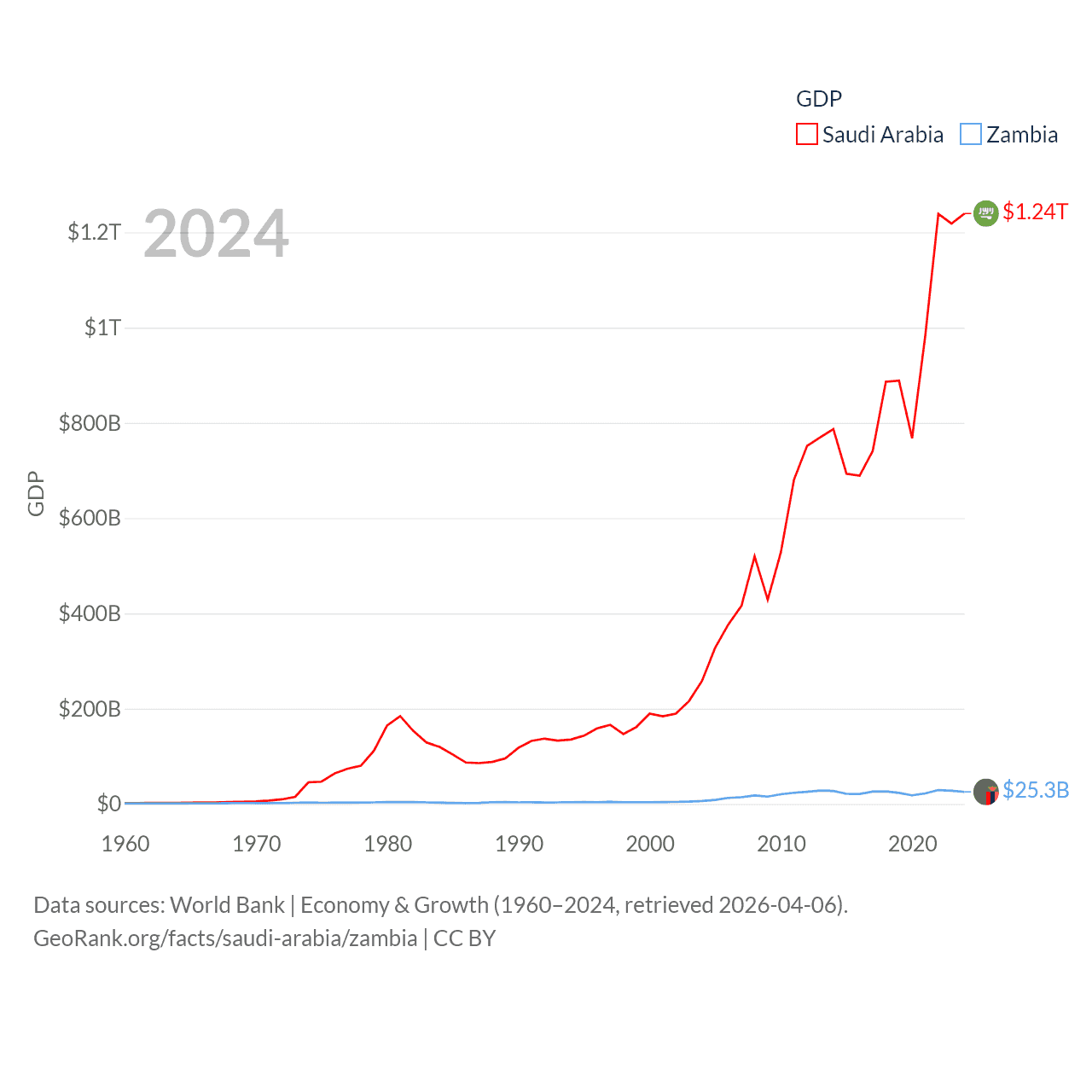 By GDP, Saudi Arabia ranks 18/197 ($1.24T) and Zambia ranks 116/197 ($25.3B). By GDP per capita, Saudi Arabia ranks 33/197 ($35,122), while Zambia ranks 169/197 ($1,187).