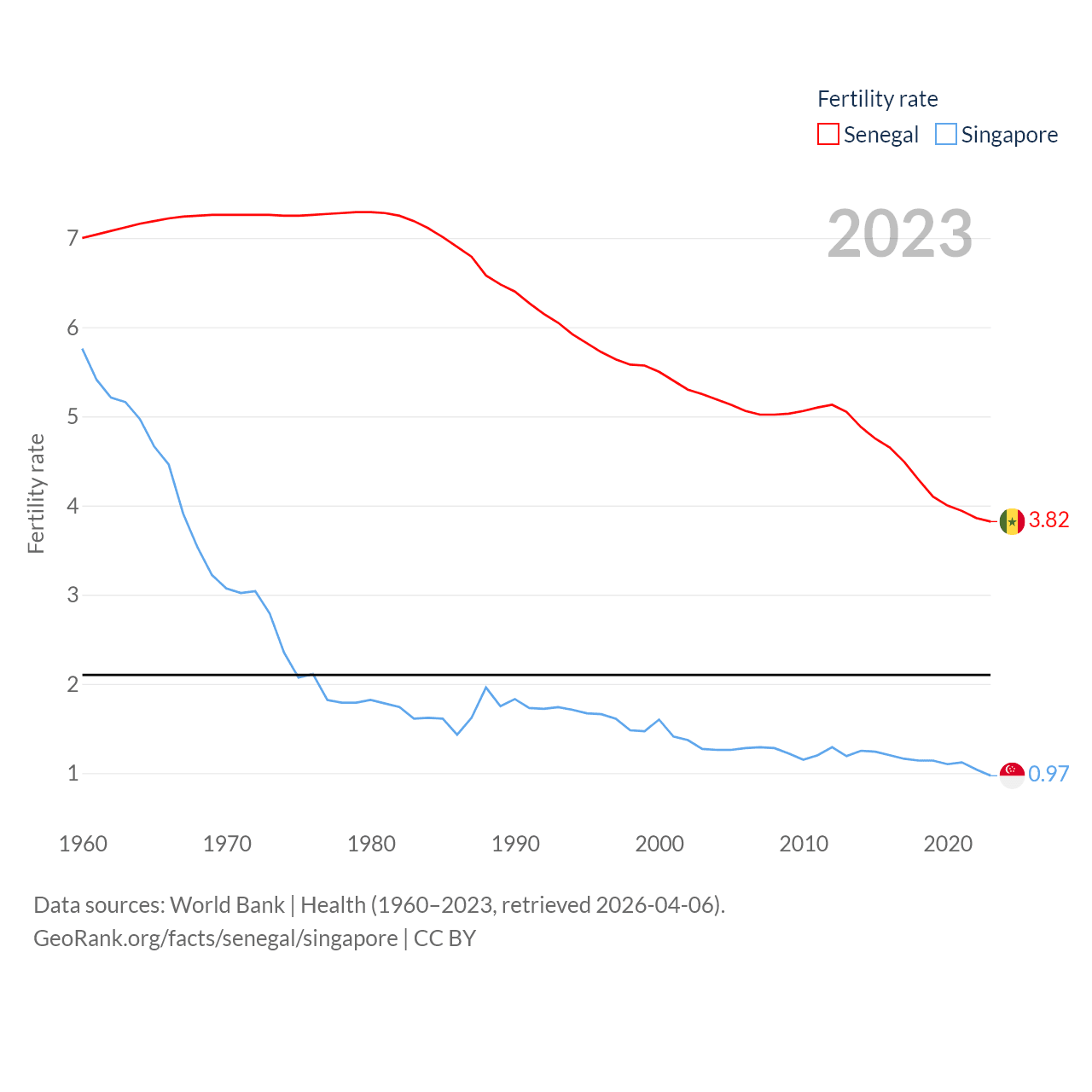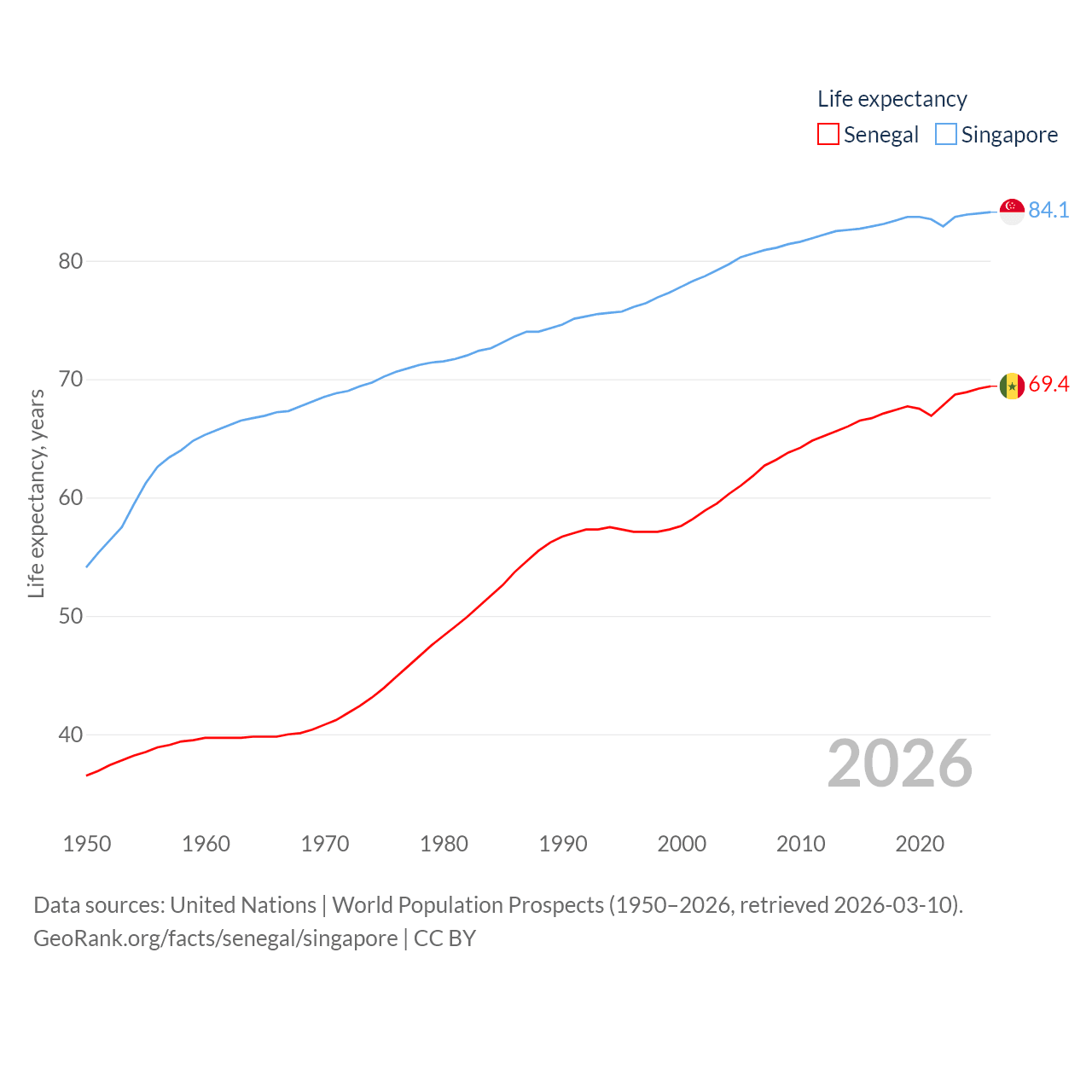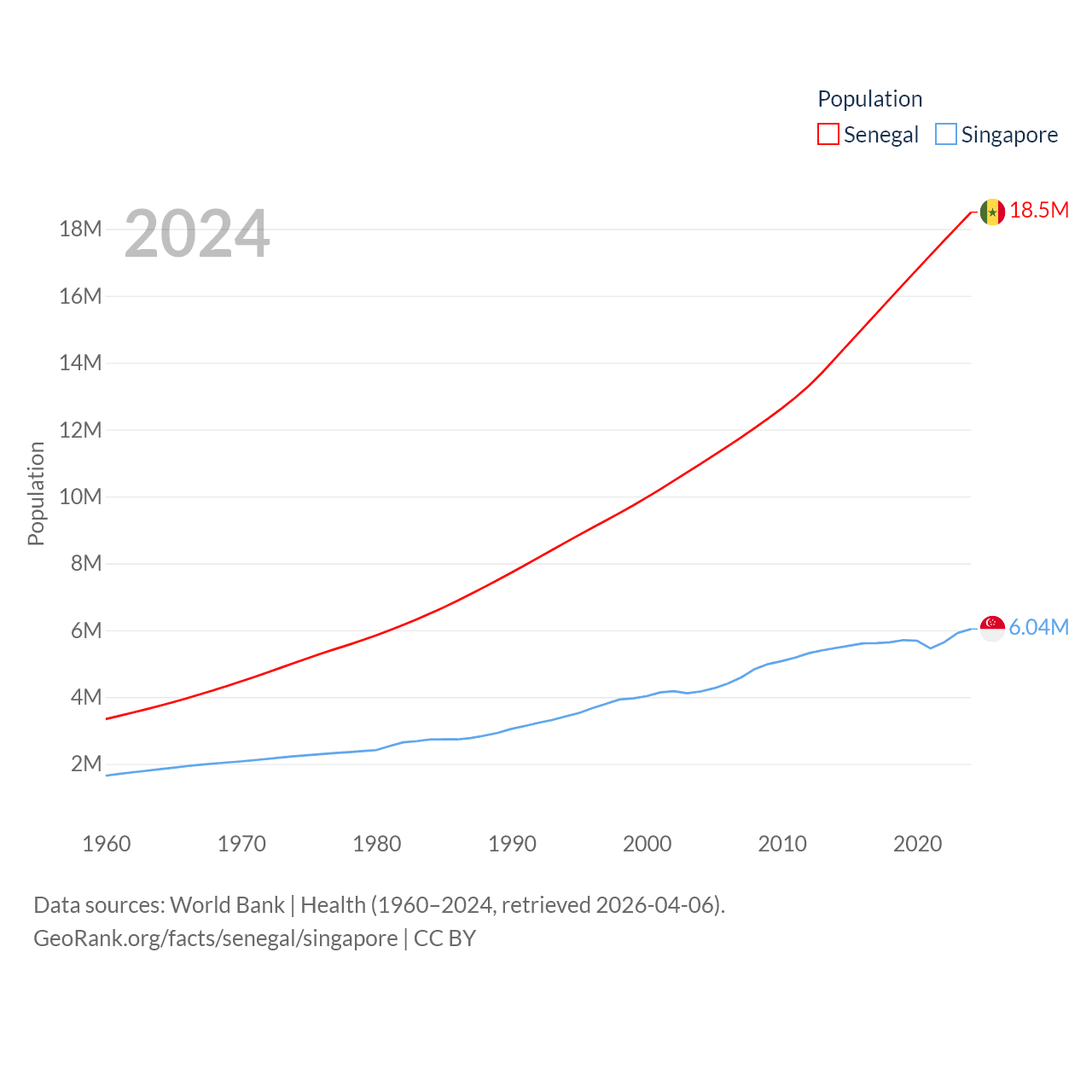 Senegal has a population of 18.5M (ranked 69/197), compared with 6.04M in Singapore (ranked 113/197). Senegal's land area is 74,336 sq mi versus 277.2 sq mi for Singapore (ranked 85th vs. 177th).