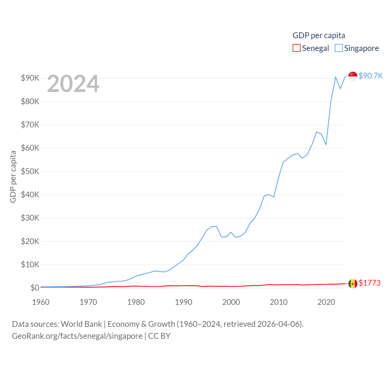 By GDP, Senegal ranks 109/197 ($32.8B) and Singapore ranks 28/197 ($547B). By GDP per capita, Senegal ranks 159/197 ($1,773), while Singapore ranks 7/197 ($90,674).