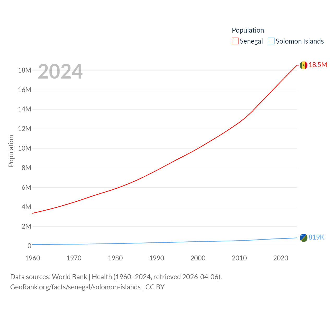 Senegal has a population of 18.5M (ranked 69/197), compared with 819K in The Solomon Islands (ranked 162/197). Senegal's land area is 74,336 sq mi versus 10,807 sq mi for The Solomon Islands (ranked 85th vs. 141st).