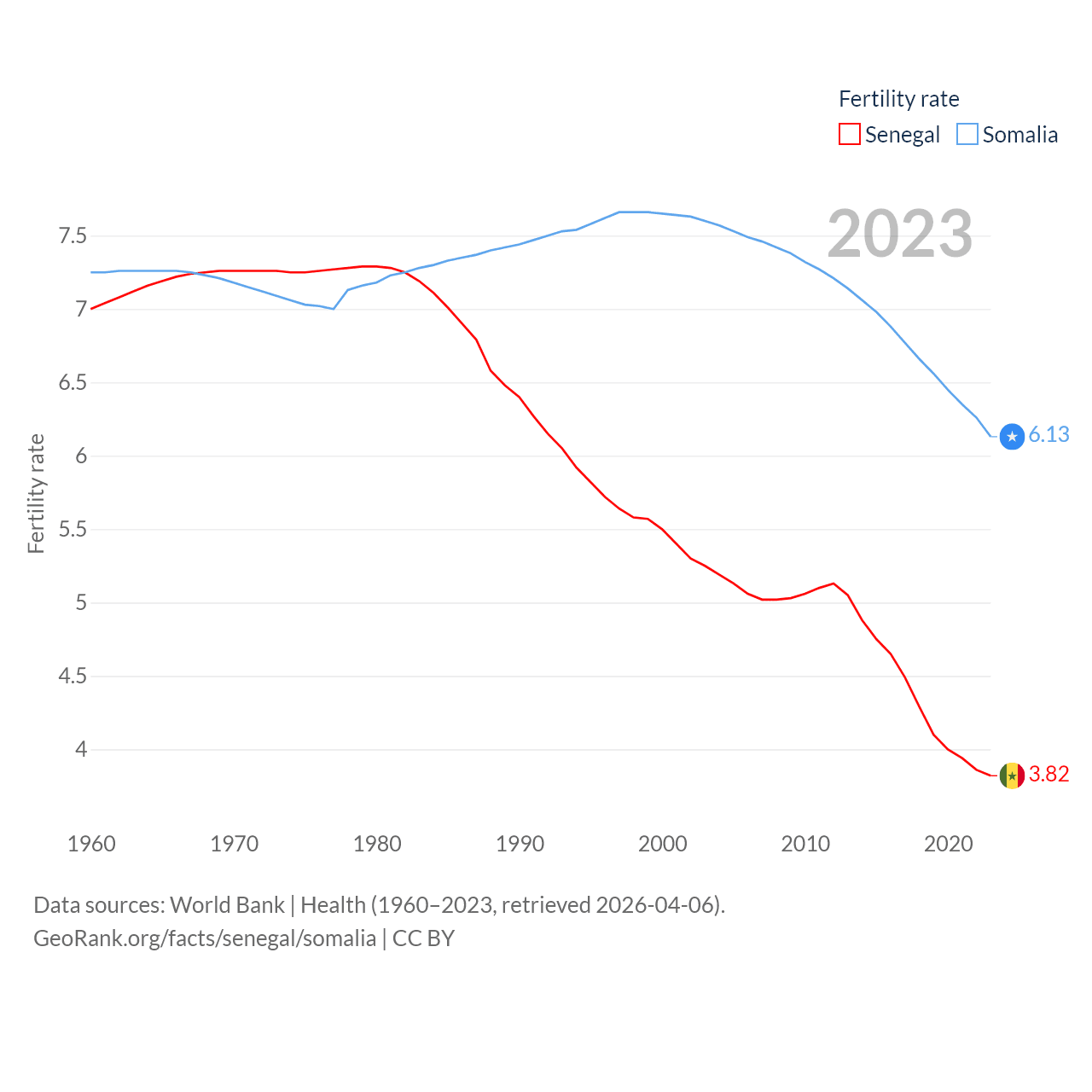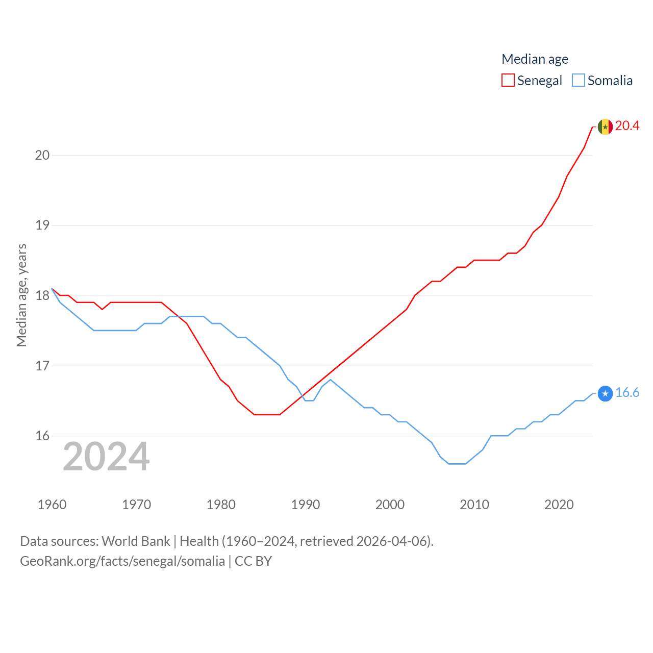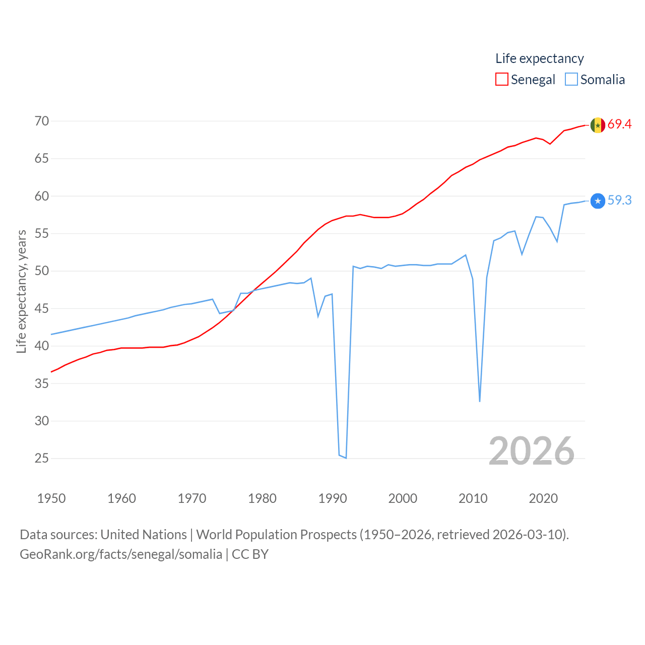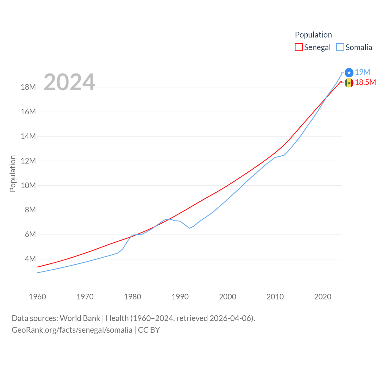 Senegal has a population of 18.5M (ranked 69/197), compared with 19M in Somalia (ranked 68/197). Senegal's land area is 74,336 sq mi versus 242,217 sq mi for Somalia (ranked 85th vs. 42nd).