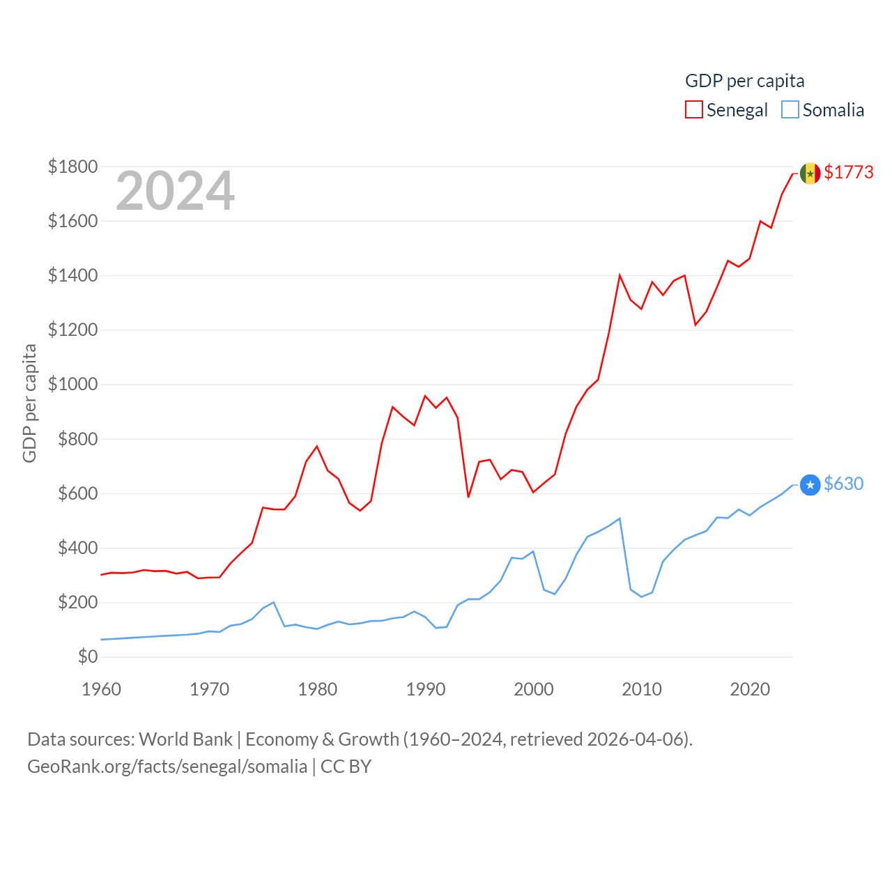 By GDP, Senegal ranks 109/197 ($32.8B) and Somalia ranks 150/197 ($12B). By GDP per capita, Senegal ranks 159/197 ($1,773), while Somalia ranks 192/197 ($630).