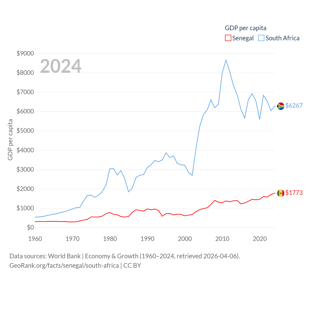 By GDP, Senegal ranks 109/197 ($32.8B) and South Africa ranks 40/197 ($401B). By GDP per capita, Senegal ranks 159/197 ($1,773), while South Africa ranks 111/197 ($6,267).