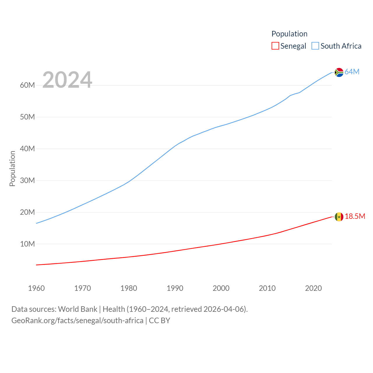 Senegal has a population of 18.5M (ranked 69/197), compared with 64M in South Africa (ranked 24/197). Senegal's land area is 74,336 sq mi versus 468,377 sq mi for South Africa (ranked 85th vs. 24th).