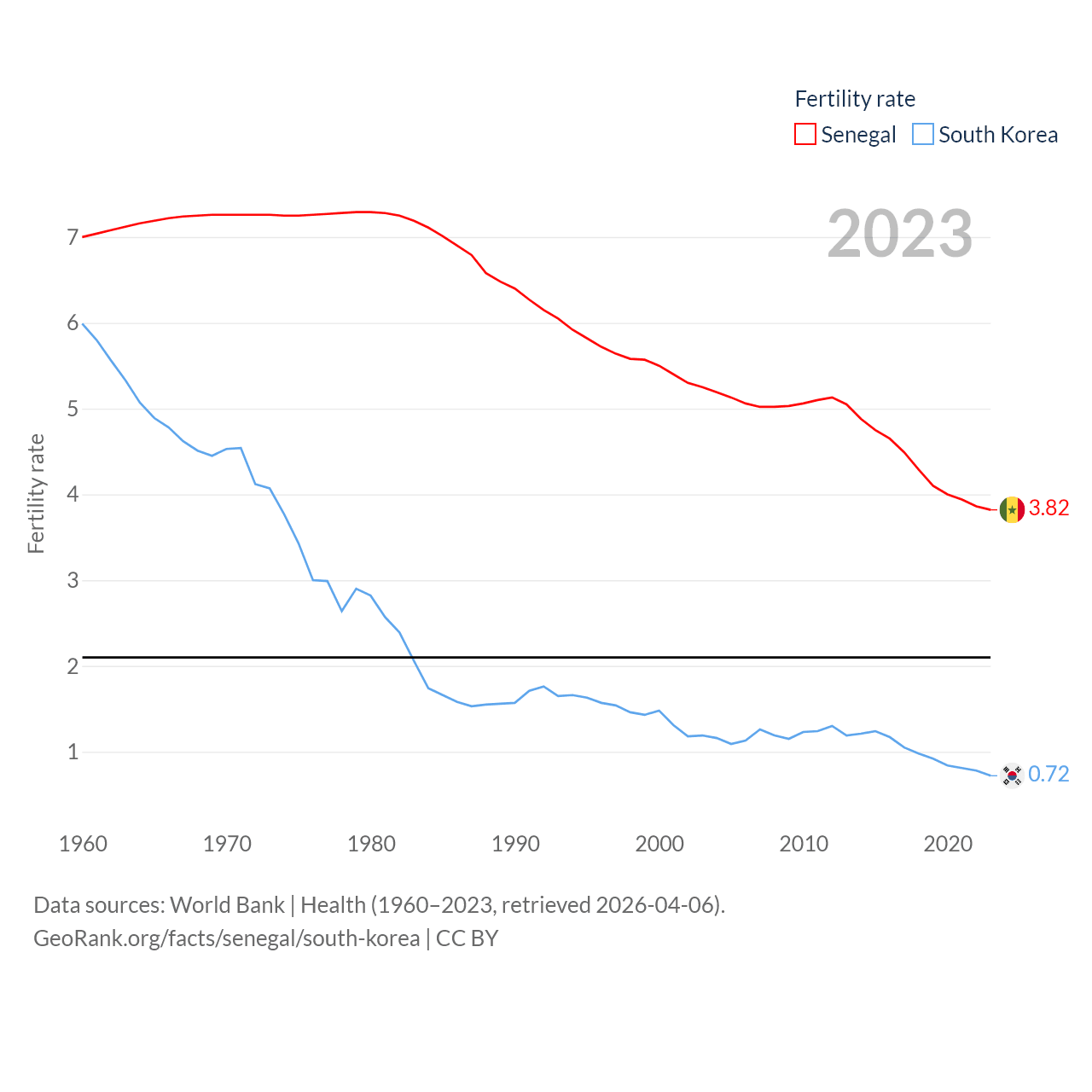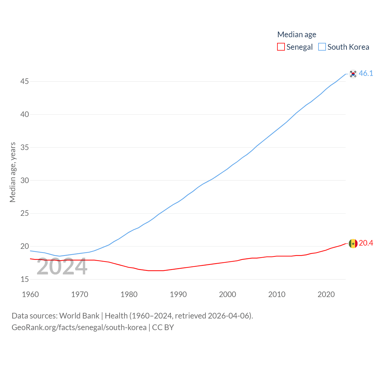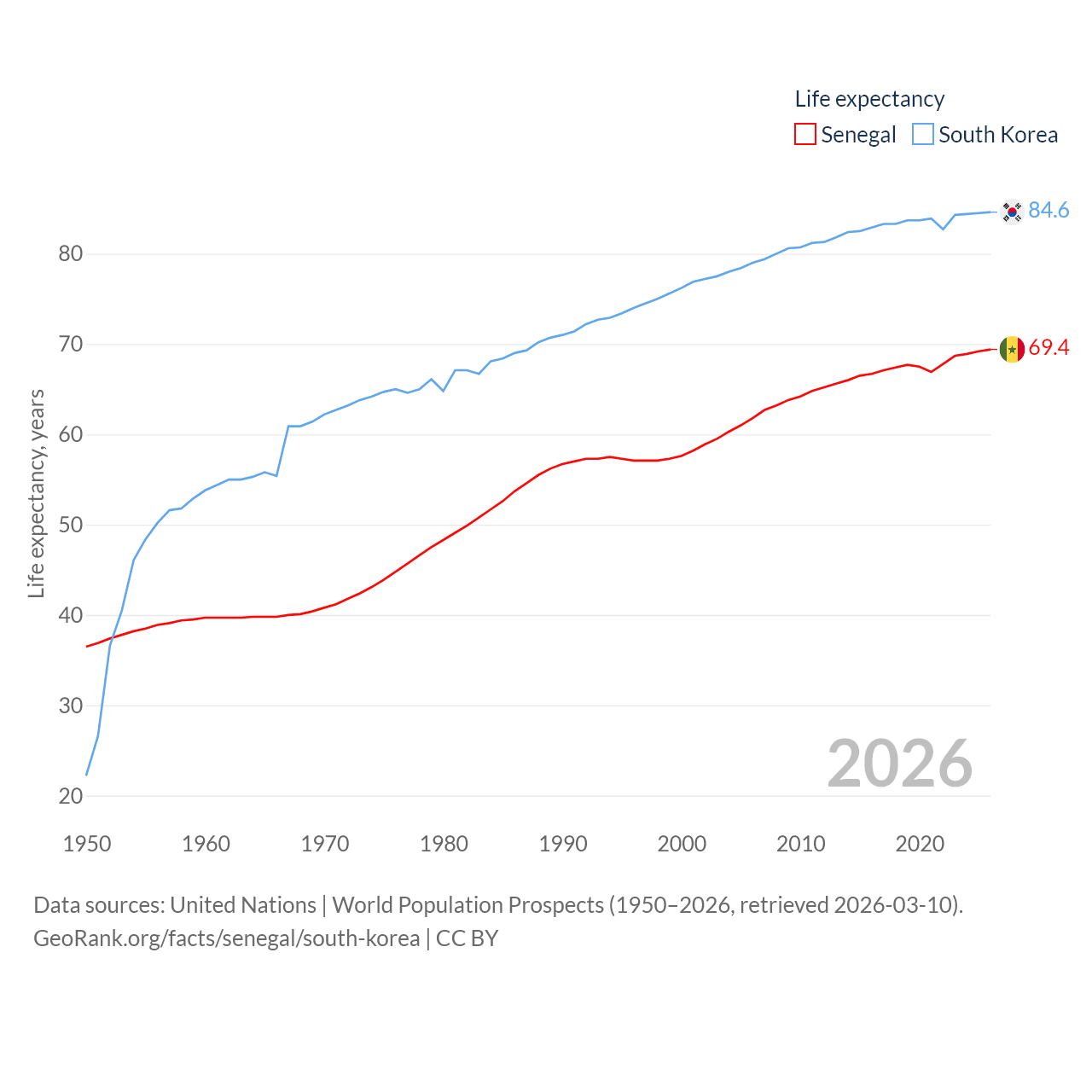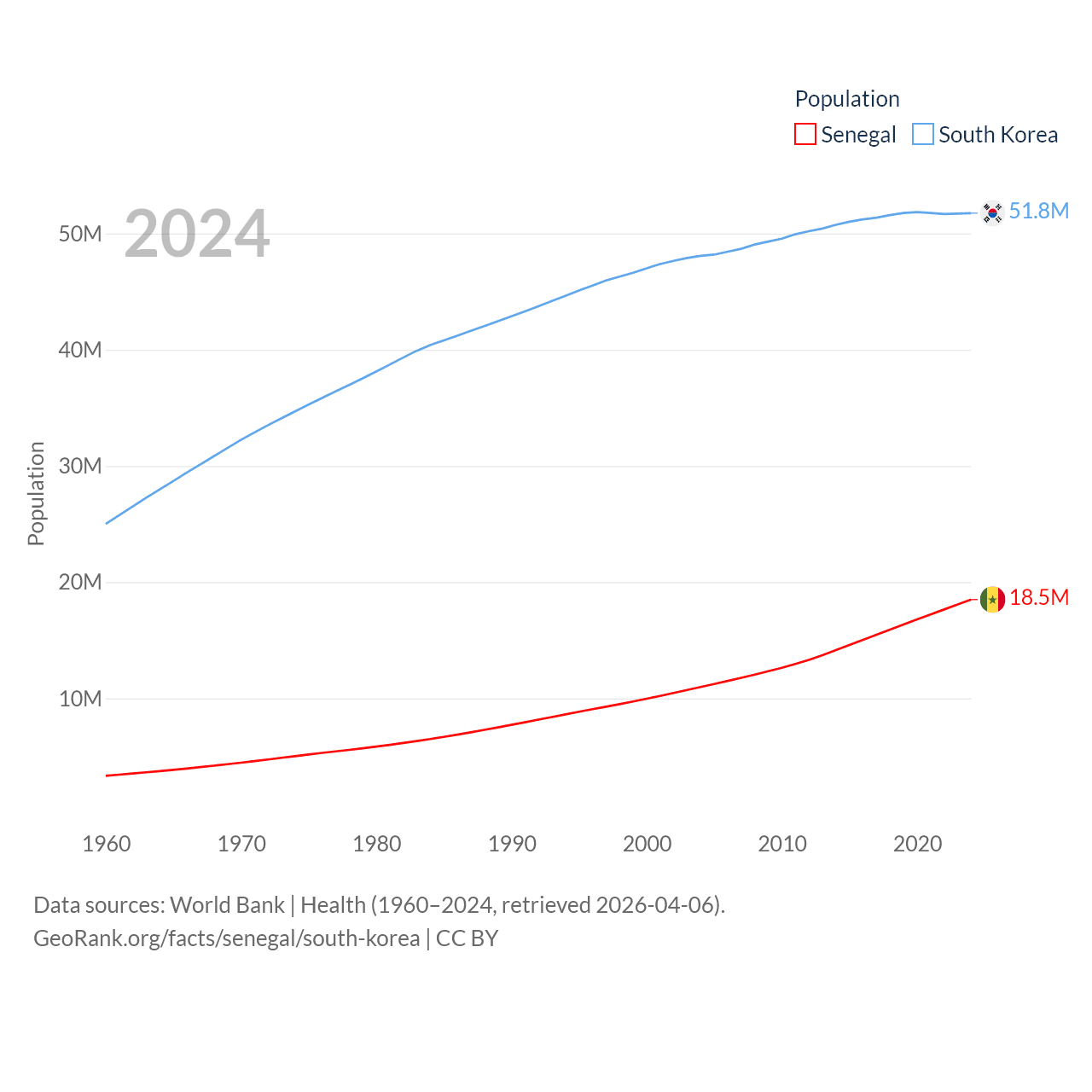Senegal has a population of 18.5M (ranked 69/197), compared with 51.8M in South Korea (ranked 29/197). Senegal's land area is 74,336 sq mi versus 37,684 sq mi for South Korea (ranked 85th vs. 105th).