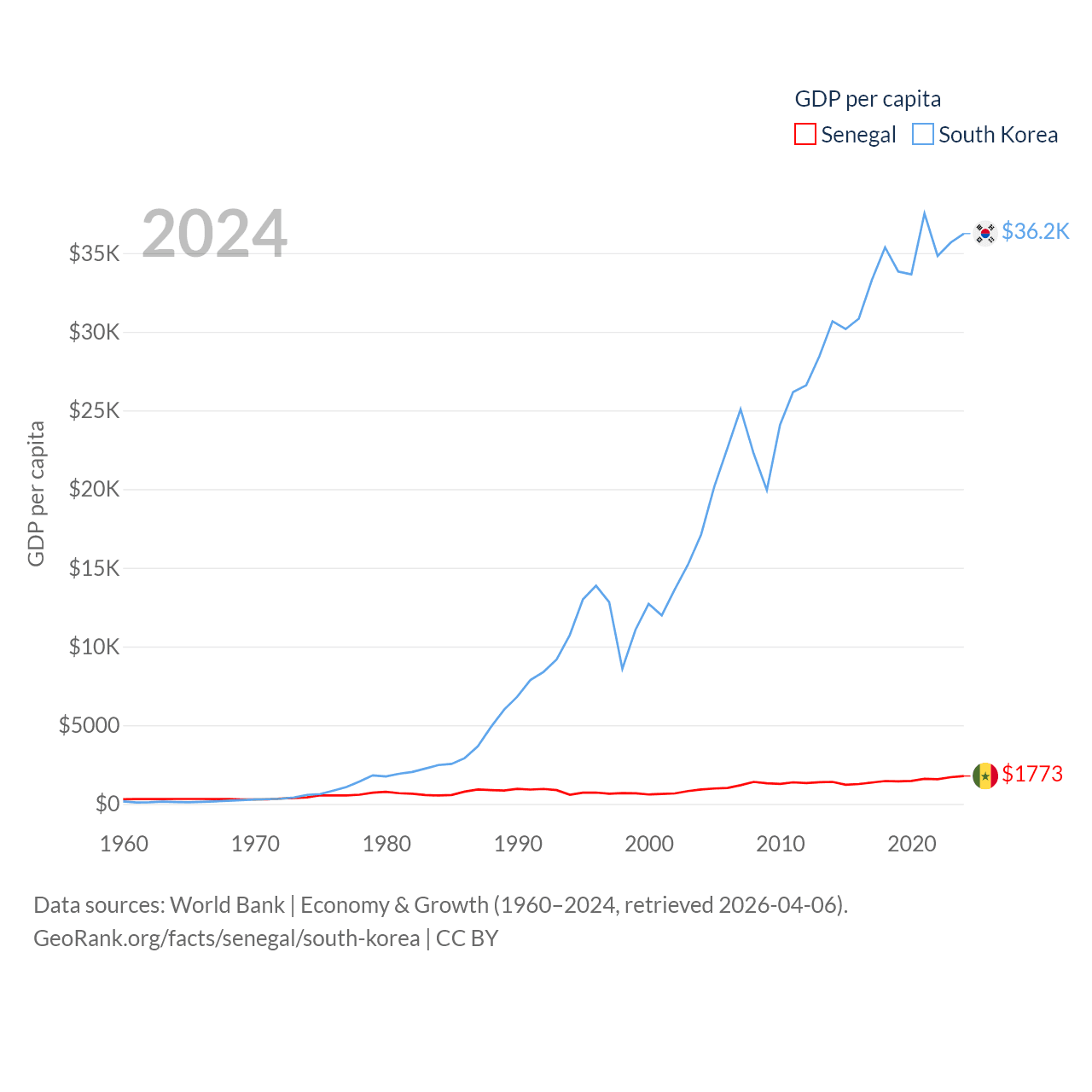 By GDP, Senegal ranks 109/197 ($32.8B) and South Korea ranks 12/197 ($1.88T). By GDP per capita, Senegal ranks 159/197 ($1,773), while South Korea ranks 31/197 ($36,239).