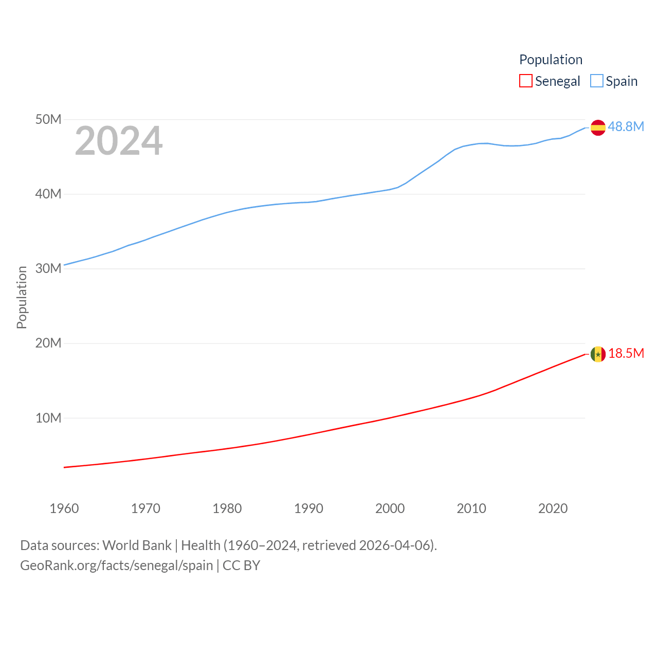 Senegal has a population of 18.5M (ranked 69/197), compared with 48.8M in Spain (ranked 32/197). Senegal's land area is 74,336 sq mi versus 192,934 sq mi for Spain (ranked 85th vs. 51st).