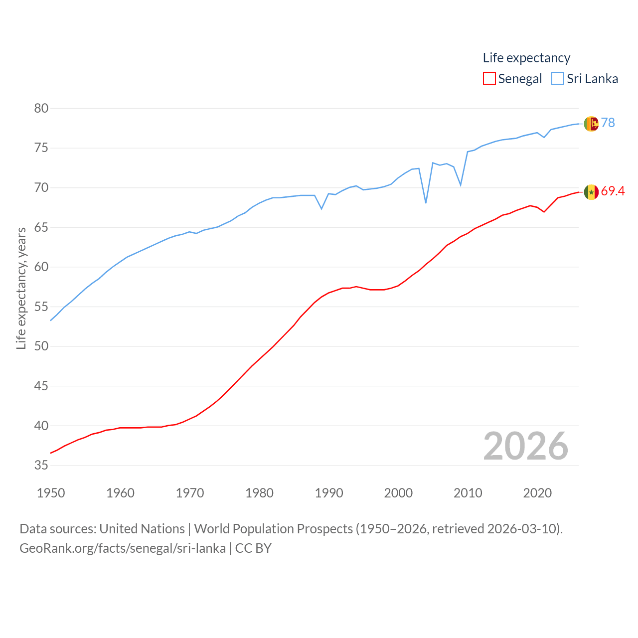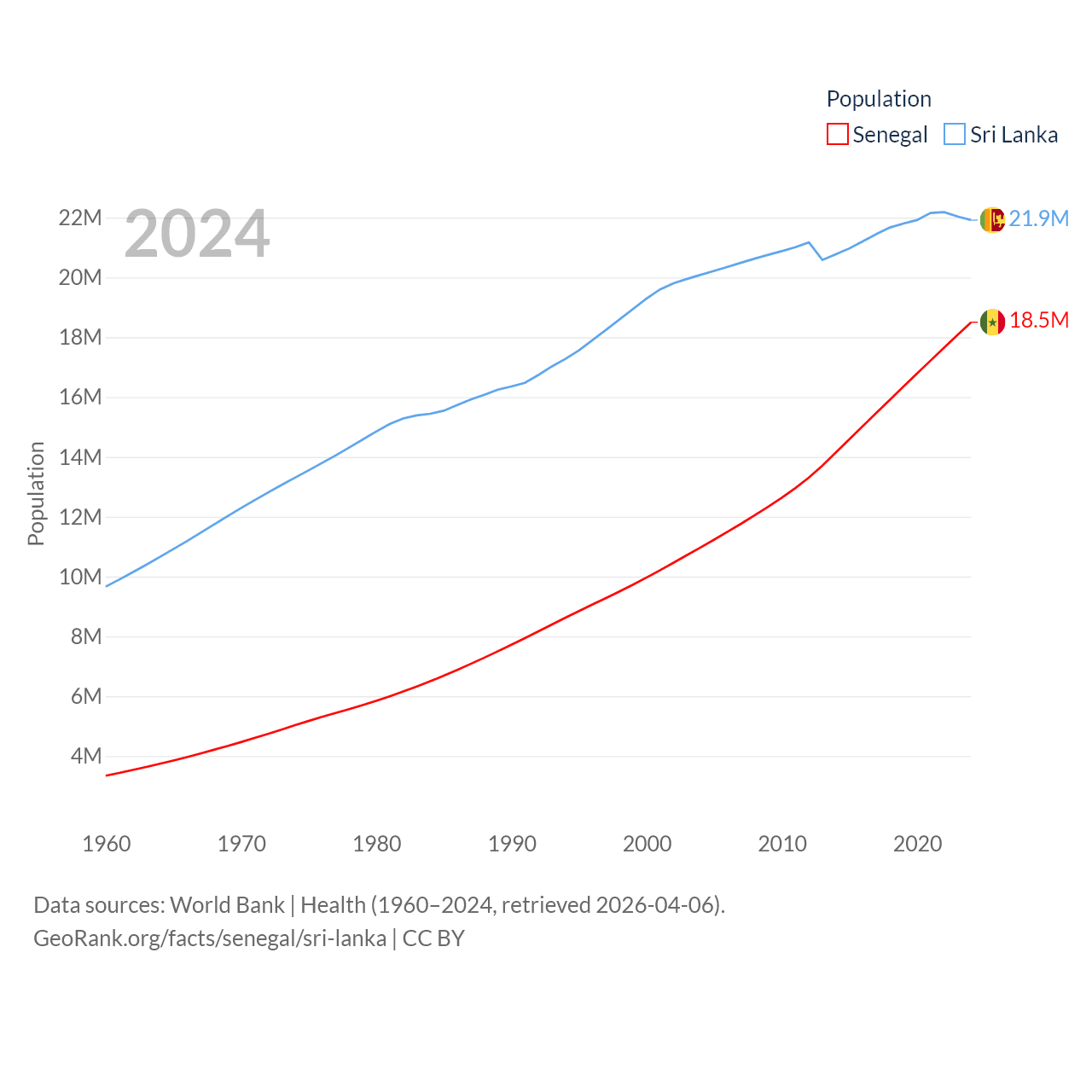 Senegal has a population of 18.5M (ranked 69/197), compared with 21.9M in Sri Lanka (ranked 61/197). Senegal's land area is 74,336 sq mi versus 23,884 sq mi for Sri Lanka (ranked 85th vs. 122nd).
