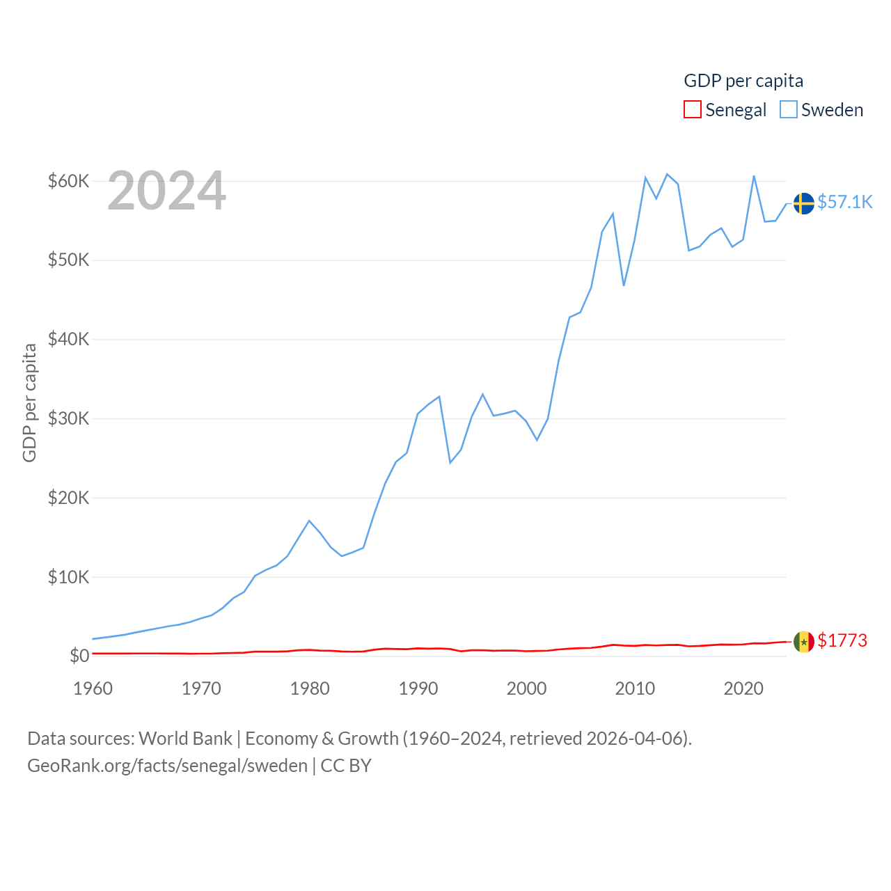 By GDP, Senegal ranks 109/197 ($32.8B) and Sweden ranks 26/197 ($604B). By GDP per capita, Senegal ranks 159/197 ($1,773), while Sweden ranks 17/197 ($57,117).