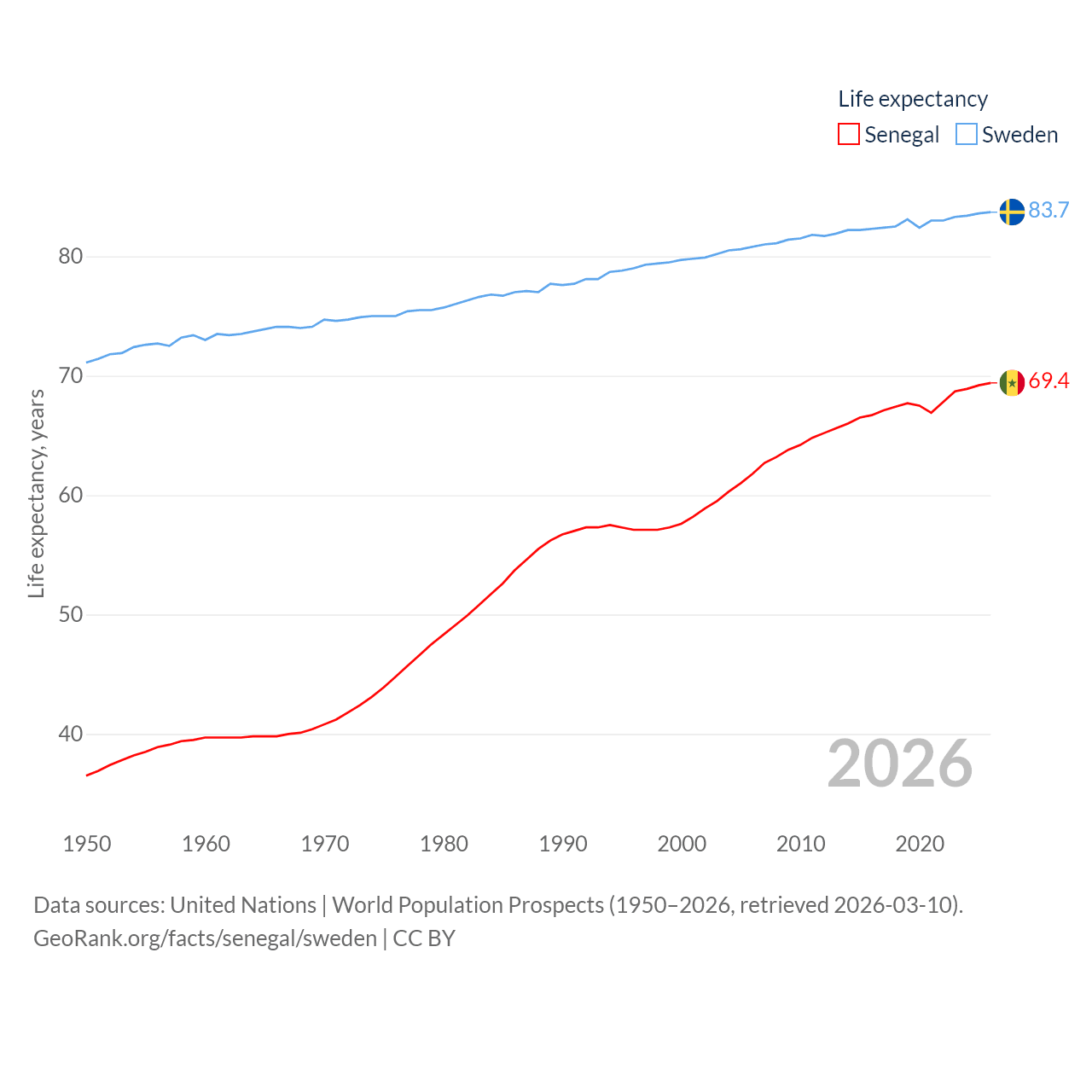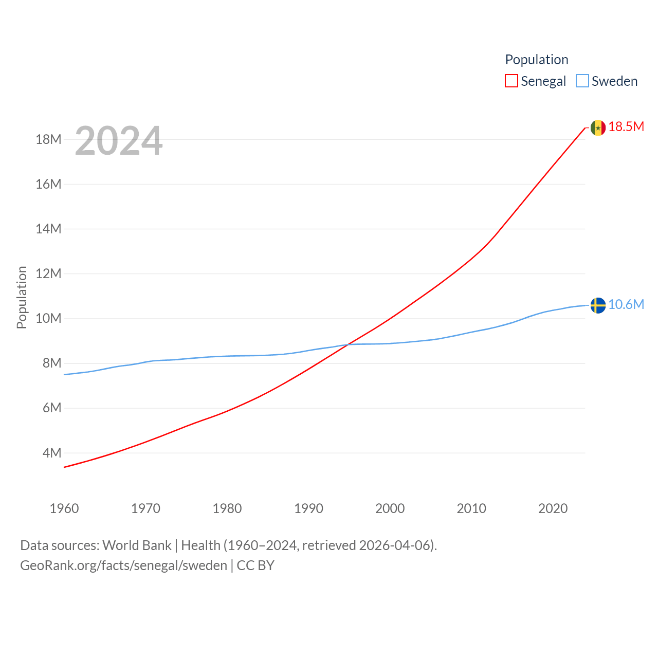 Senegal has a population of 18.5M (ranked 69/197), compared with 10.6M in Sweden (ranked 93/197). Senegal's land area is 74,336 sq mi versus 157,248 sq mi for Sweden (ranked 85th vs. 58th).