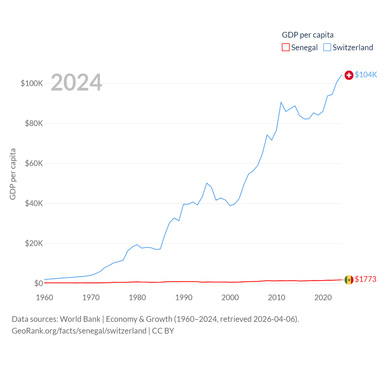 By GDP, Senegal ranks 109/197 ($32.8B) and Switzerland ranks 20/197 ($937B). By GDP per capita, Senegal ranks 159/197 ($1,773), while Switzerland ranks 5/197 ($103,998).
