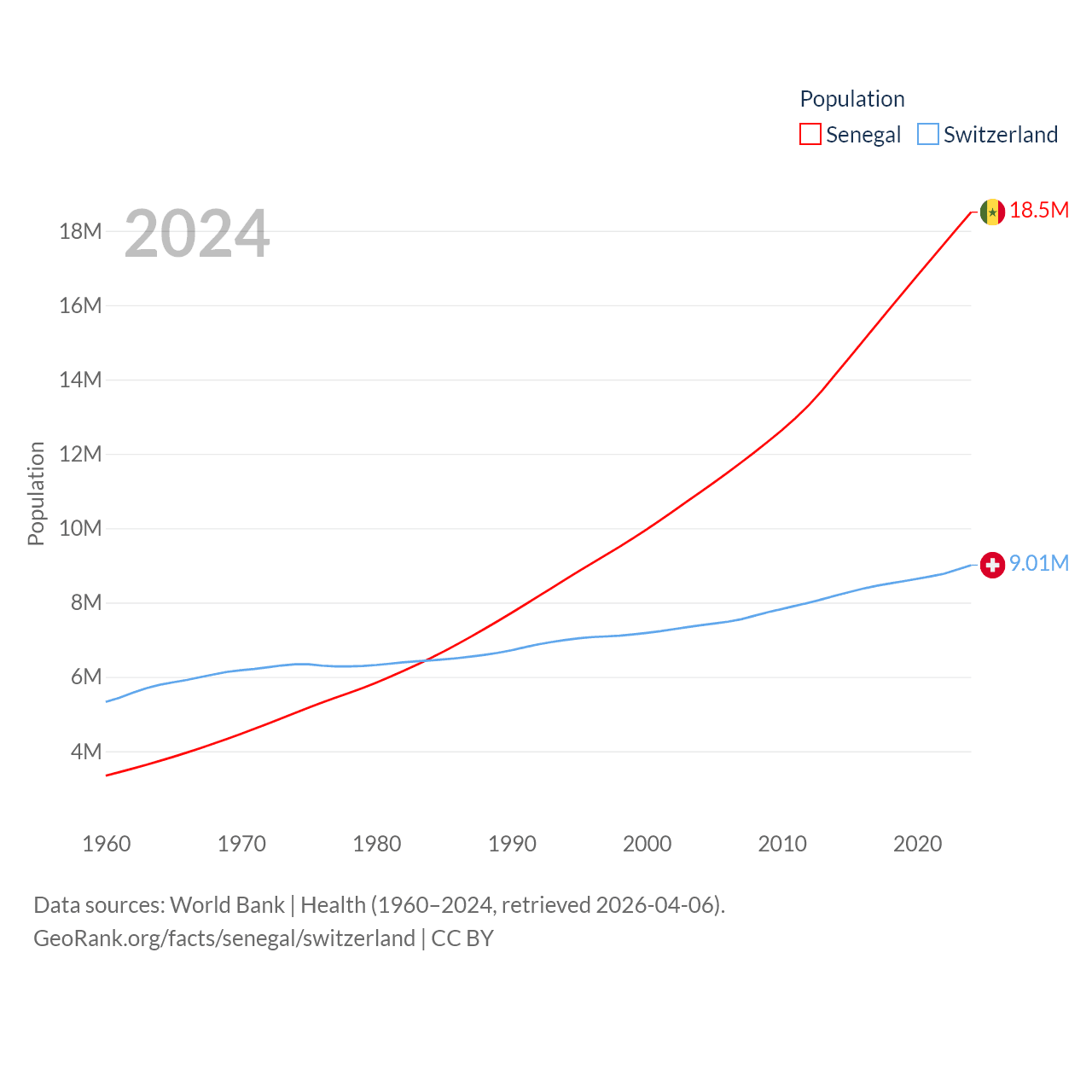 Senegal has a population of 18.5M (ranked 69/197), compared with 9.01M in Switzerland (ranked 101/197). Senegal's land area is 74,336 sq mi versus 15,255 sq mi for Switzerland (ranked 85th vs. 131st).