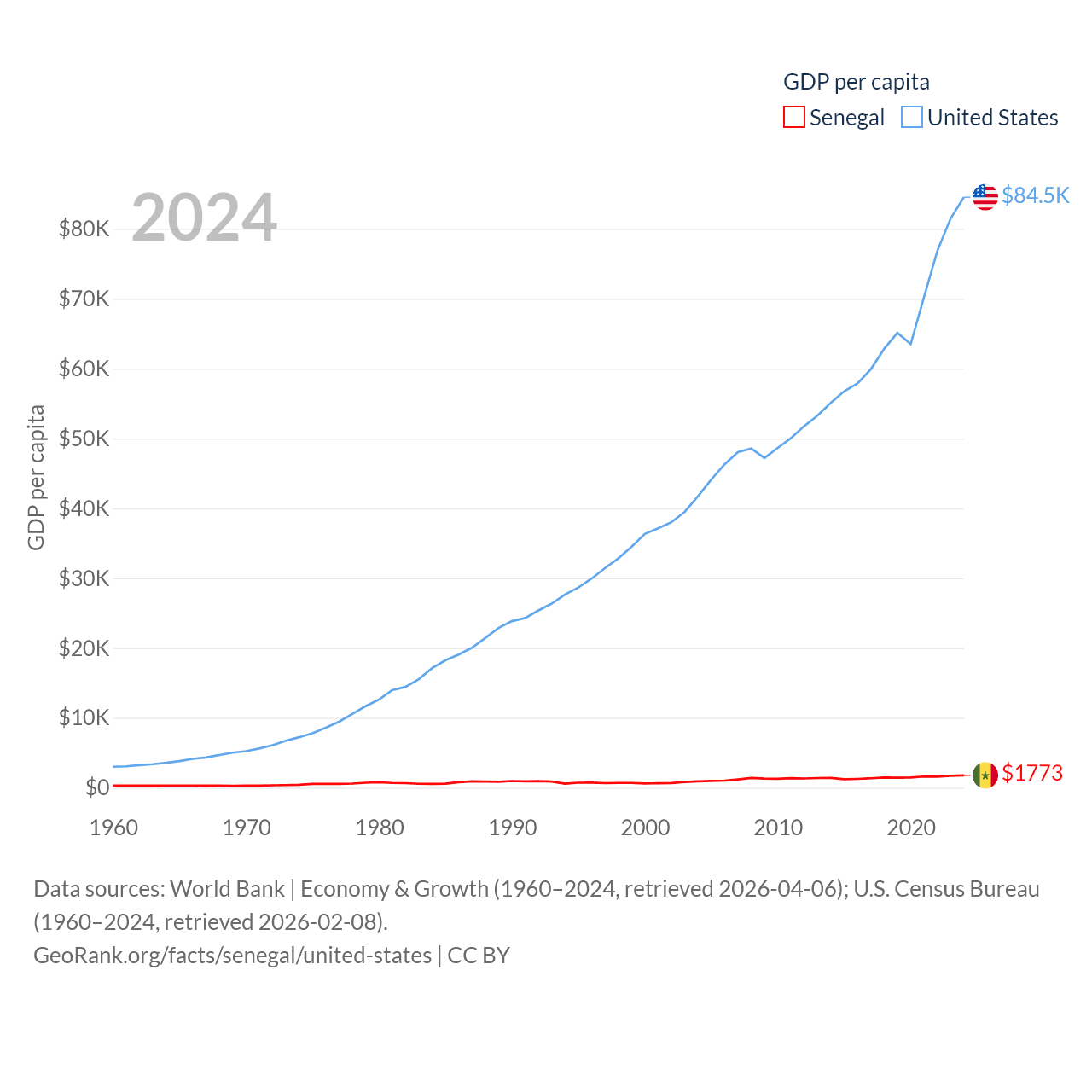 By GDP, Senegal ranks 109/197 ($32.8B) and The United States ranks 1/197 ($28.8T). By GDP per capita, Senegal ranks 159/197 ($1,773), while The United States ranks 10/197 ($84,534).