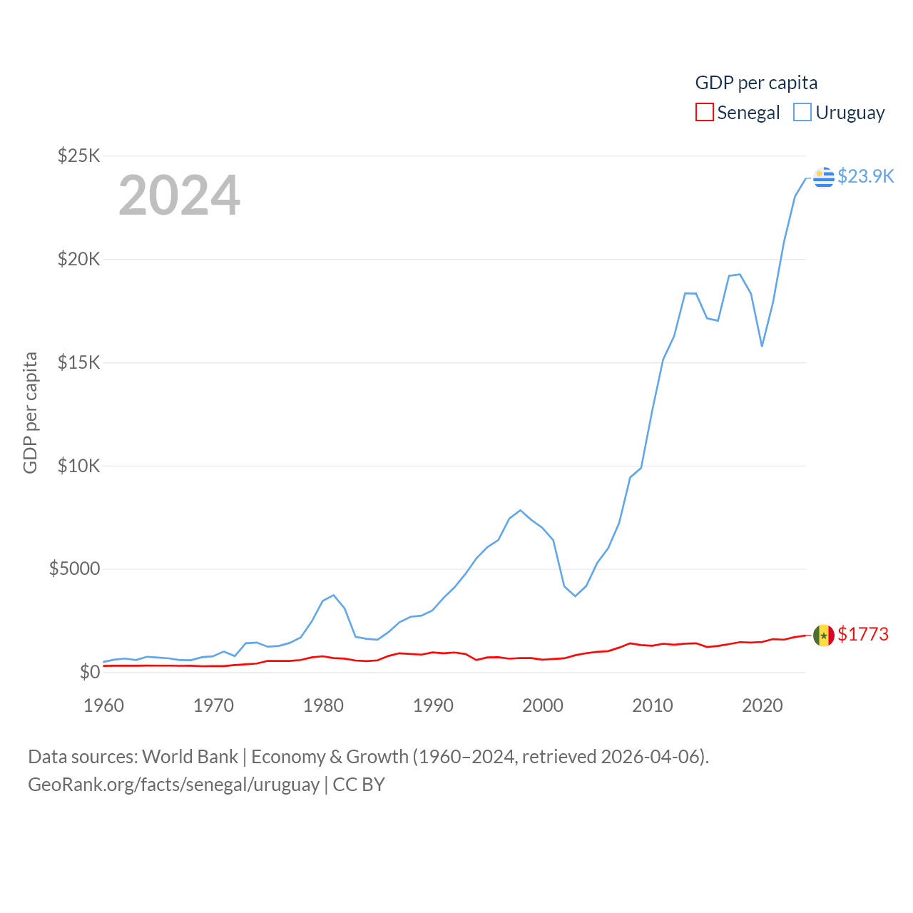 By GDP, Senegal ranks 109/197 ($32.8B) and Uruguay ranks 81/197 ($81B). By GDP per capita, Senegal ranks 159/197 ($1,773), while Uruguay ranks 52/197 ($23,907).