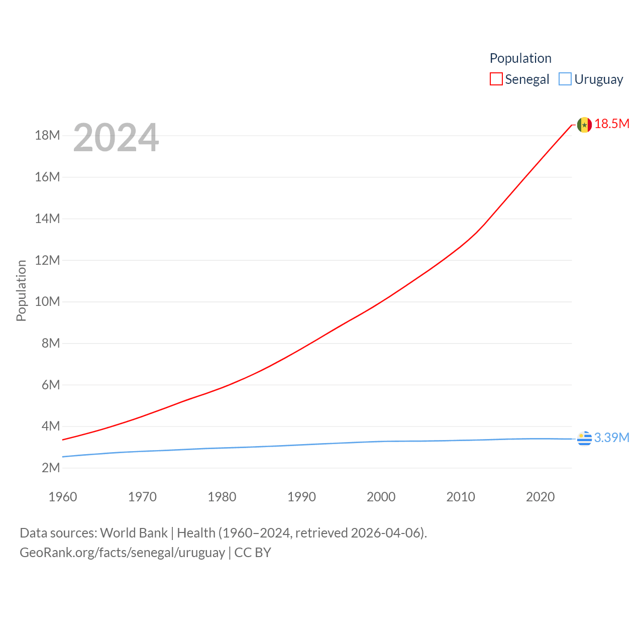 Senegal has a population of 18.5M (ranked 69/197), compared with 3.39M in Uruguay (ranked 133/197). Senegal's land area is 74,336 sq mi versus 67,576 sq mi for Uruguay (ranked 85th vs. 89th).