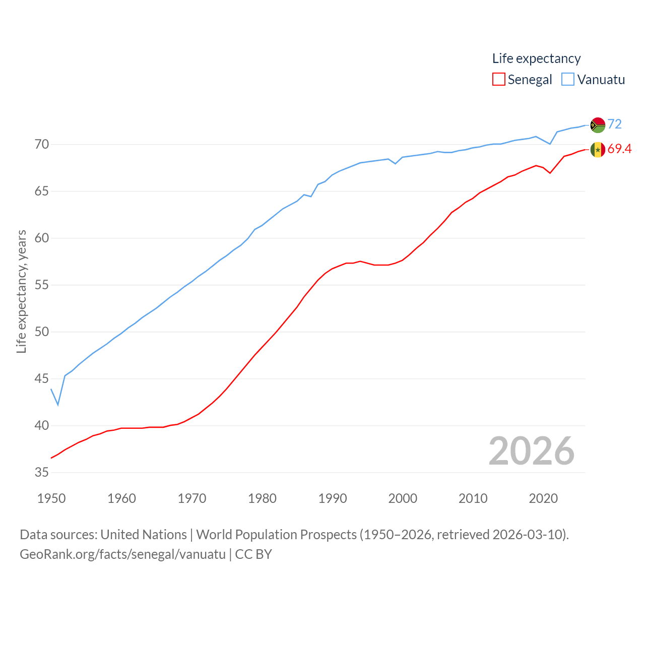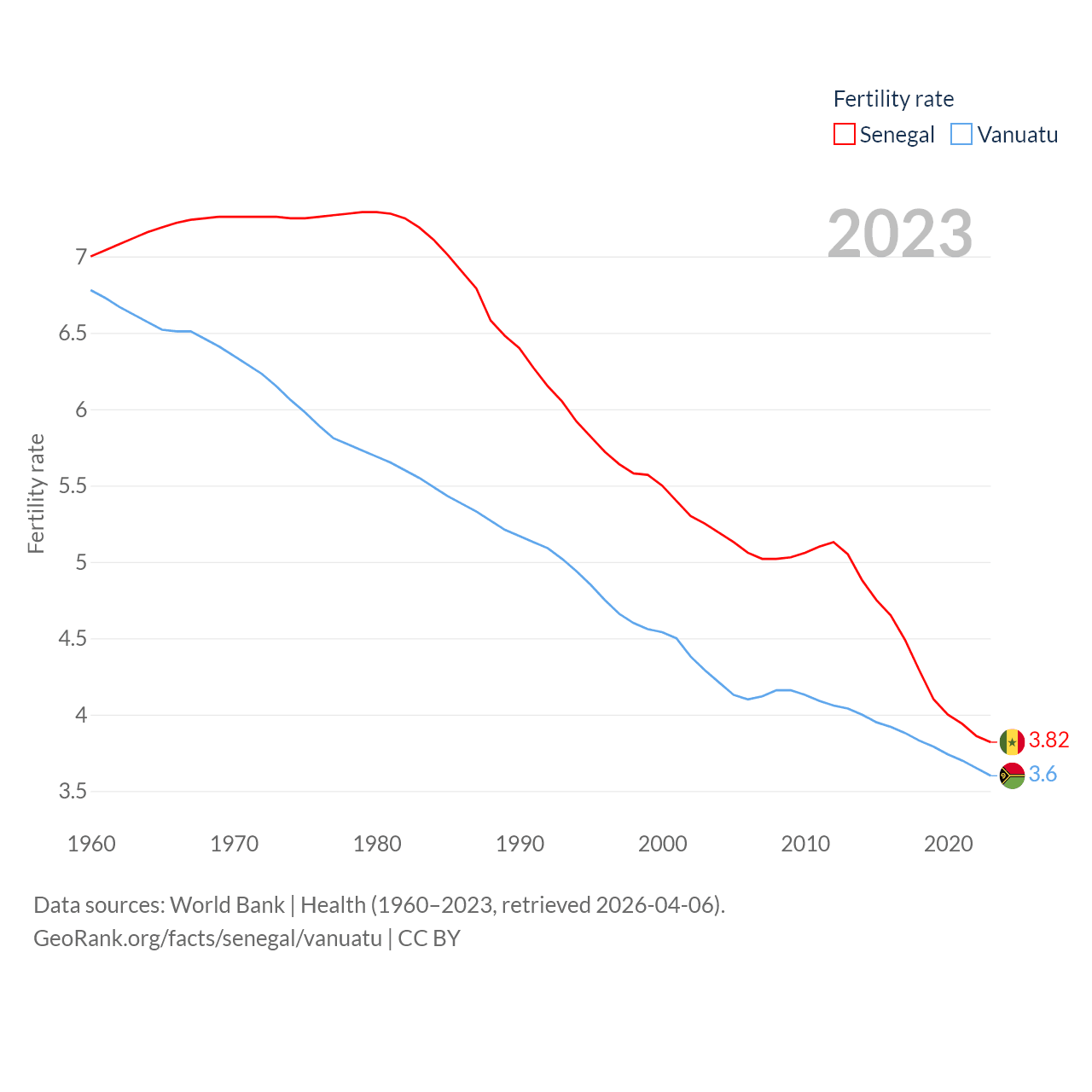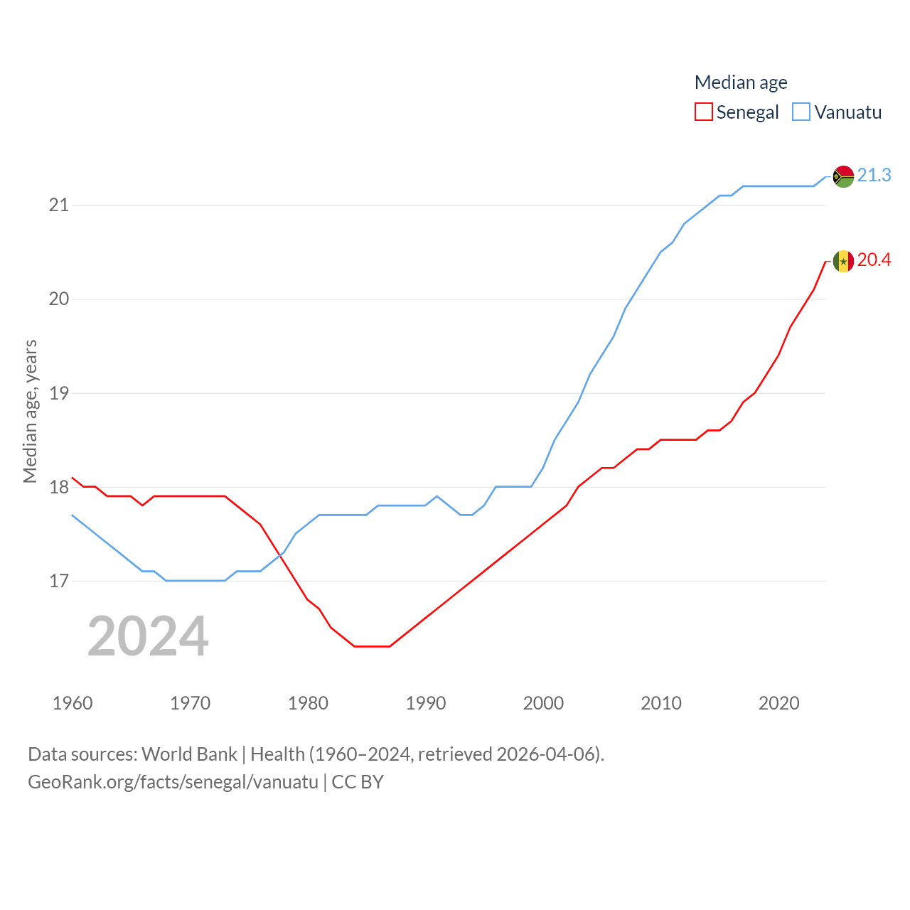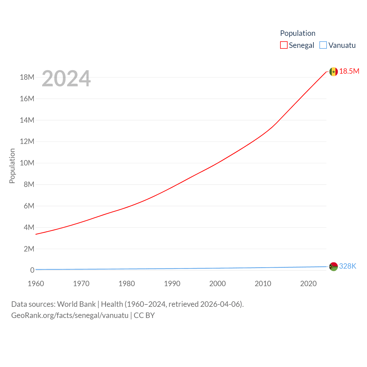 Senegal has a population of 18.5M (ranked 69/197), compared with 328K in Vanuatu (ranked 174/197). Senegal's land area is 74,336 sq mi versus 4,707 sq mi for Vanuatu (ranked 85th vs. 157th).