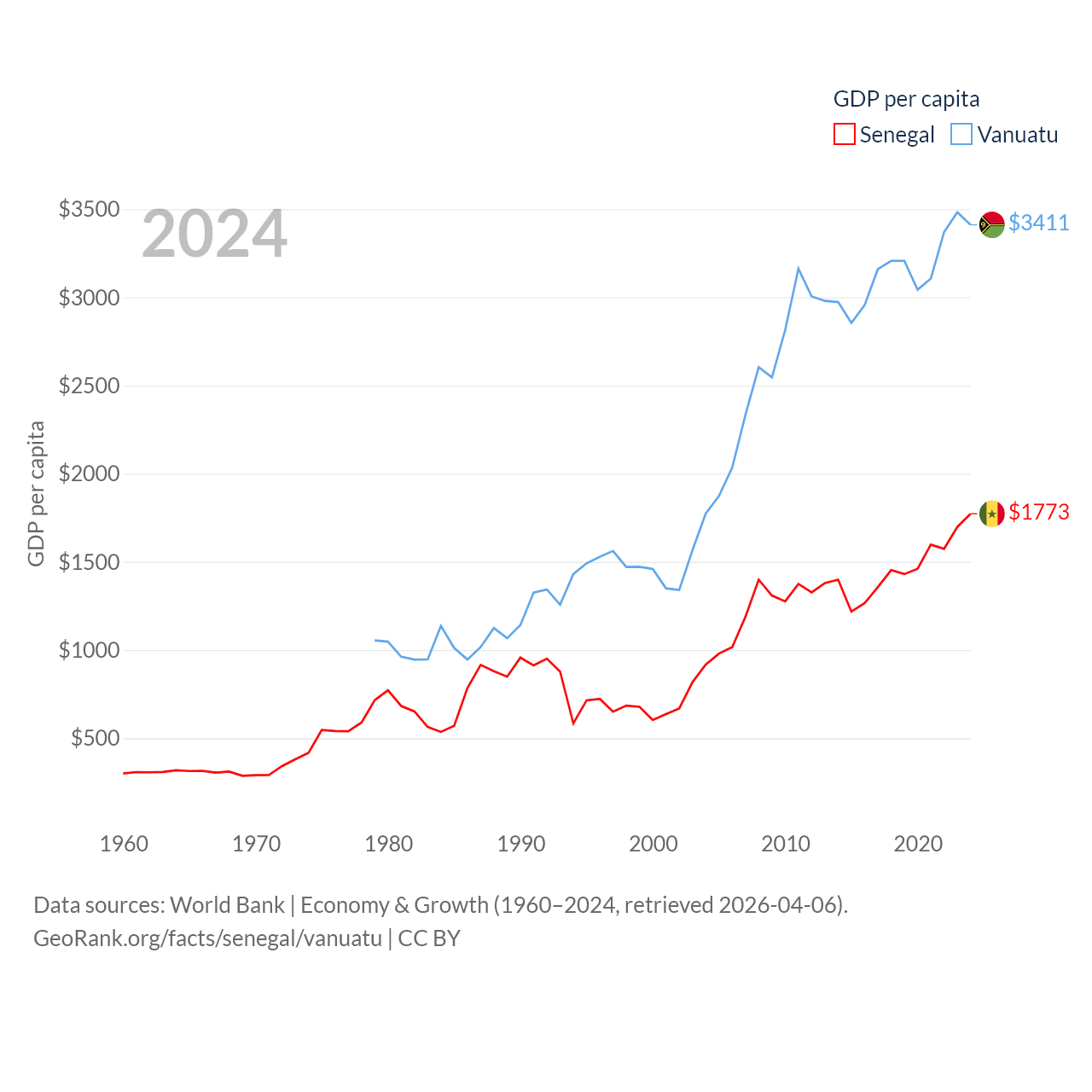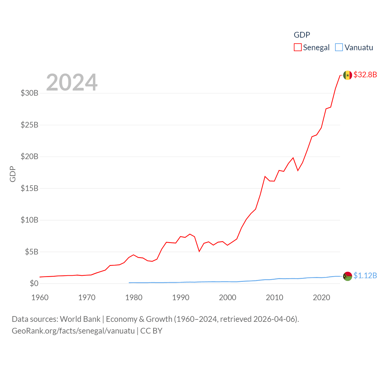 By GDP, Senegal ranks 109/197 ($32.8B) and Vanuatu ranks 188/197 ($1.12B). By GDP per capita, Senegal ranks 159/197 ($1,773), while Vanuatu ranks 137/197 ($3,411).
