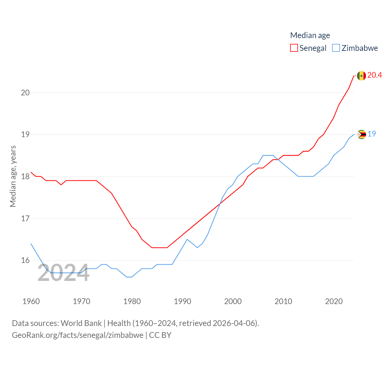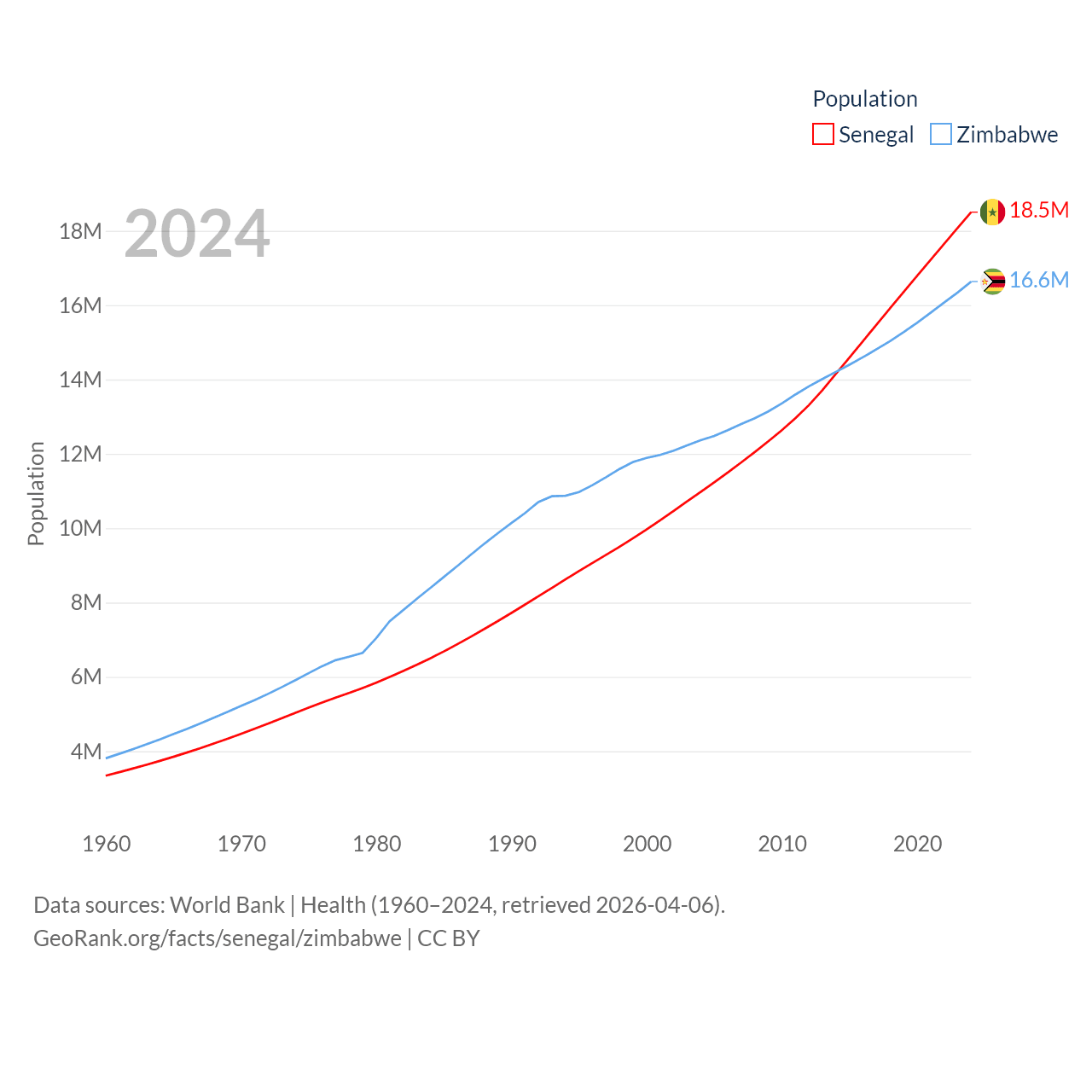 Senegal has a population of 18.5M (ranked 69/197), compared with 16.6M in Zimbabwe (ranked 74/197). Senegal's land area is 74,336 sq mi versus 149,364 sq mi for Zimbabwe (ranked 85th vs. 60th).