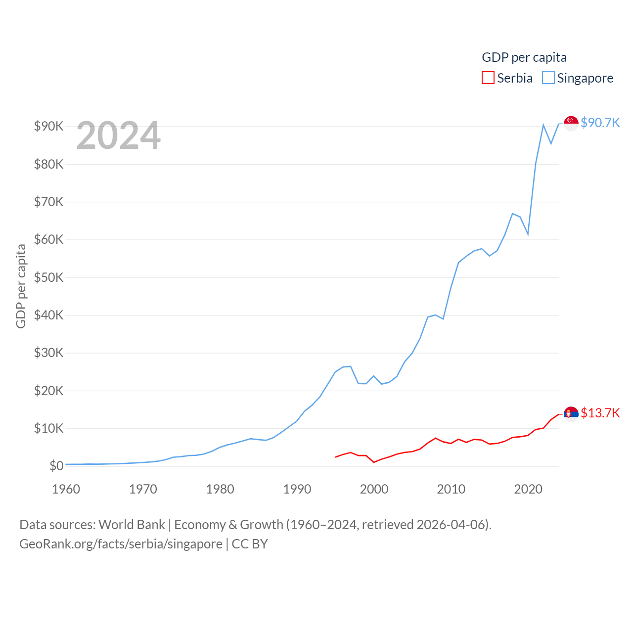 By GDP, Serbia ranks 76/197 ($90.1B) and Singapore ranks 28/197 ($547B). By GDP per capita, Serbia ranks 73/197 ($13,679), while Singapore ranks 7/197 ($90,674).