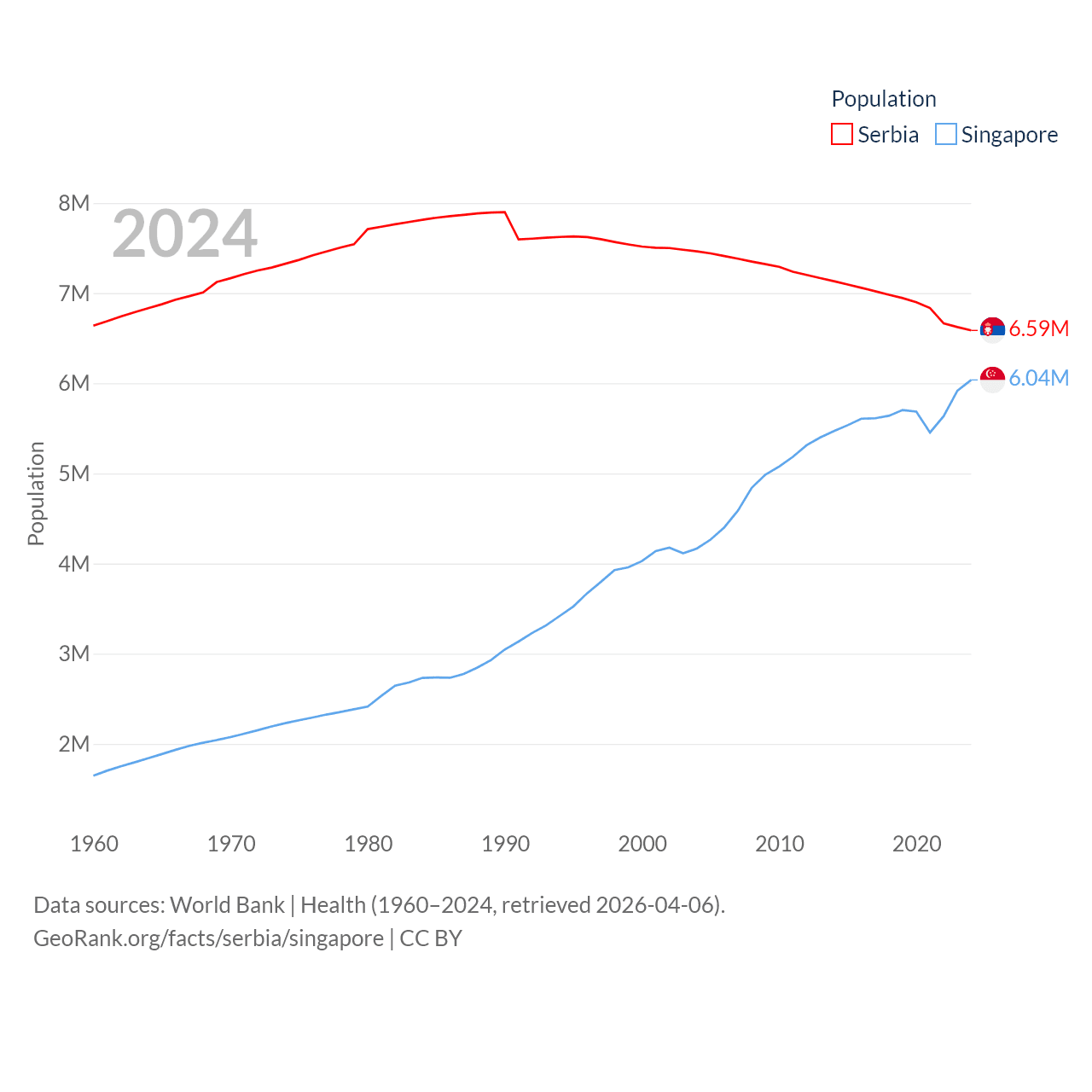 Serbia has a population of 6.59M (ranked 109/197), compared with 6.04M in Singapore (ranked 113/197). Serbia's land area is 32,467 sq mi versus 277.2 sq mi for Singapore (ranked 111th vs. 177th).