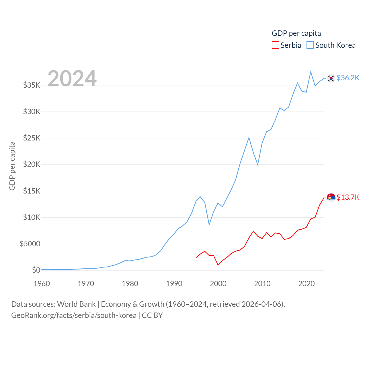 By GDP, Serbia ranks 76/197 ($90.1B) and South Korea ranks 12/197 ($1.88T). By GDP per capita, Serbia ranks 73/197 ($13,679), while South Korea ranks 31/197 ($36,239).