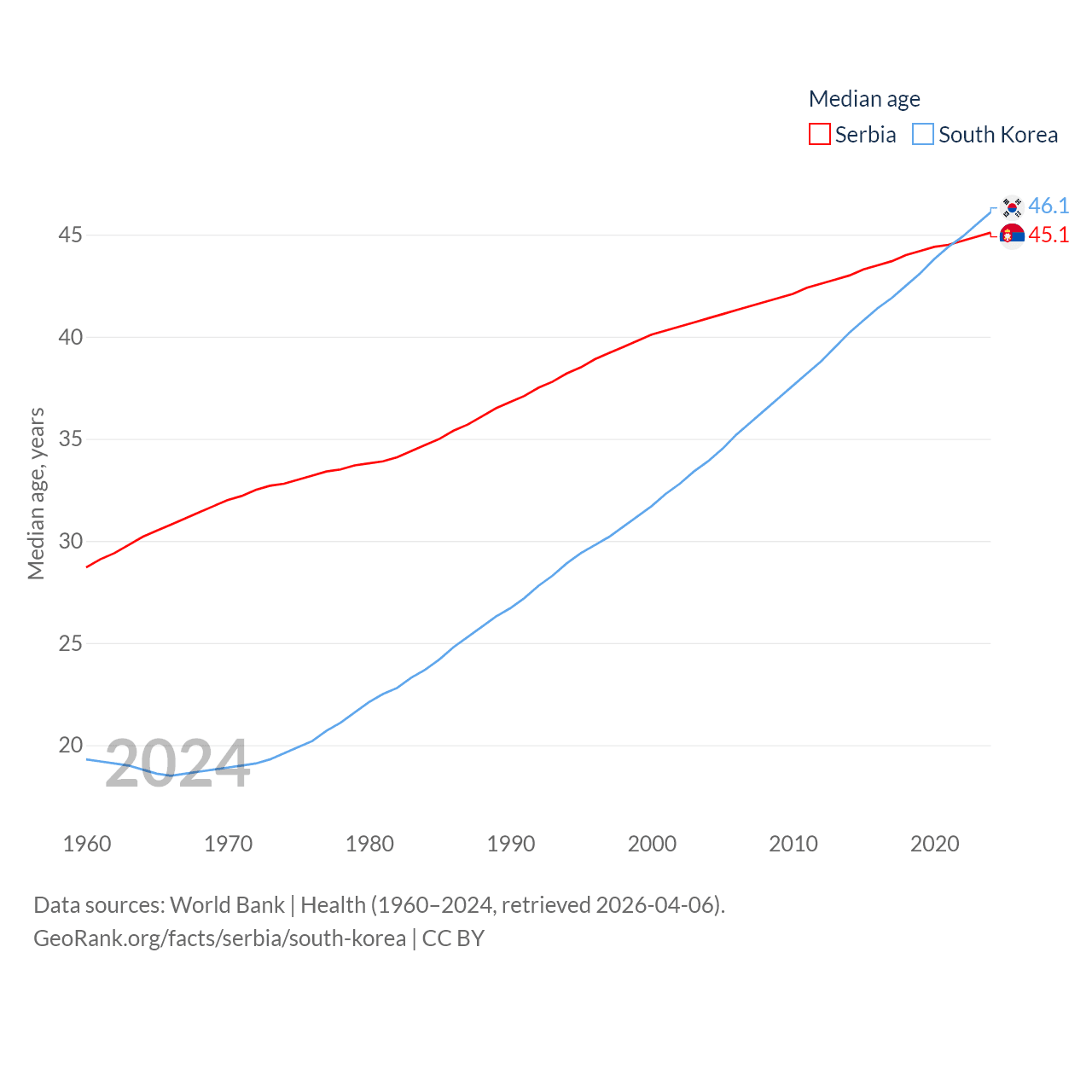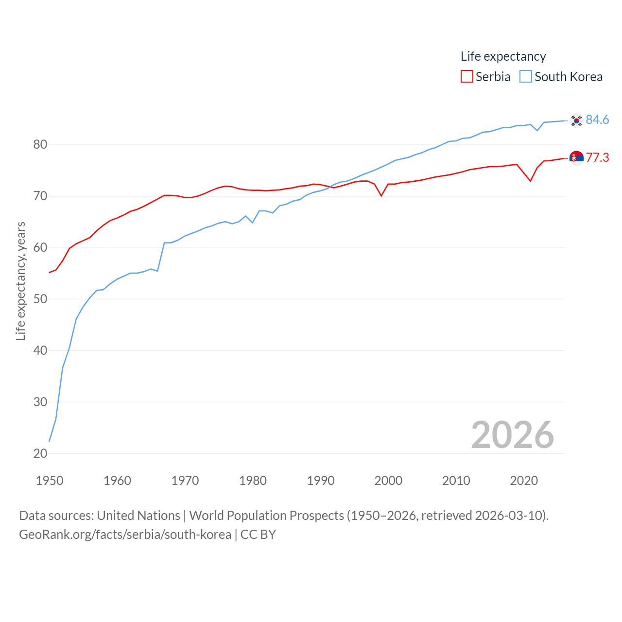 Serbia has a population of 6.59M (ranked 109/197), compared with 51.8M in South Korea (ranked 29/197). Serbia's land area is 32,467 sq mi versus 37,684 sq mi for South Korea (ranked 111th vs. 105th).