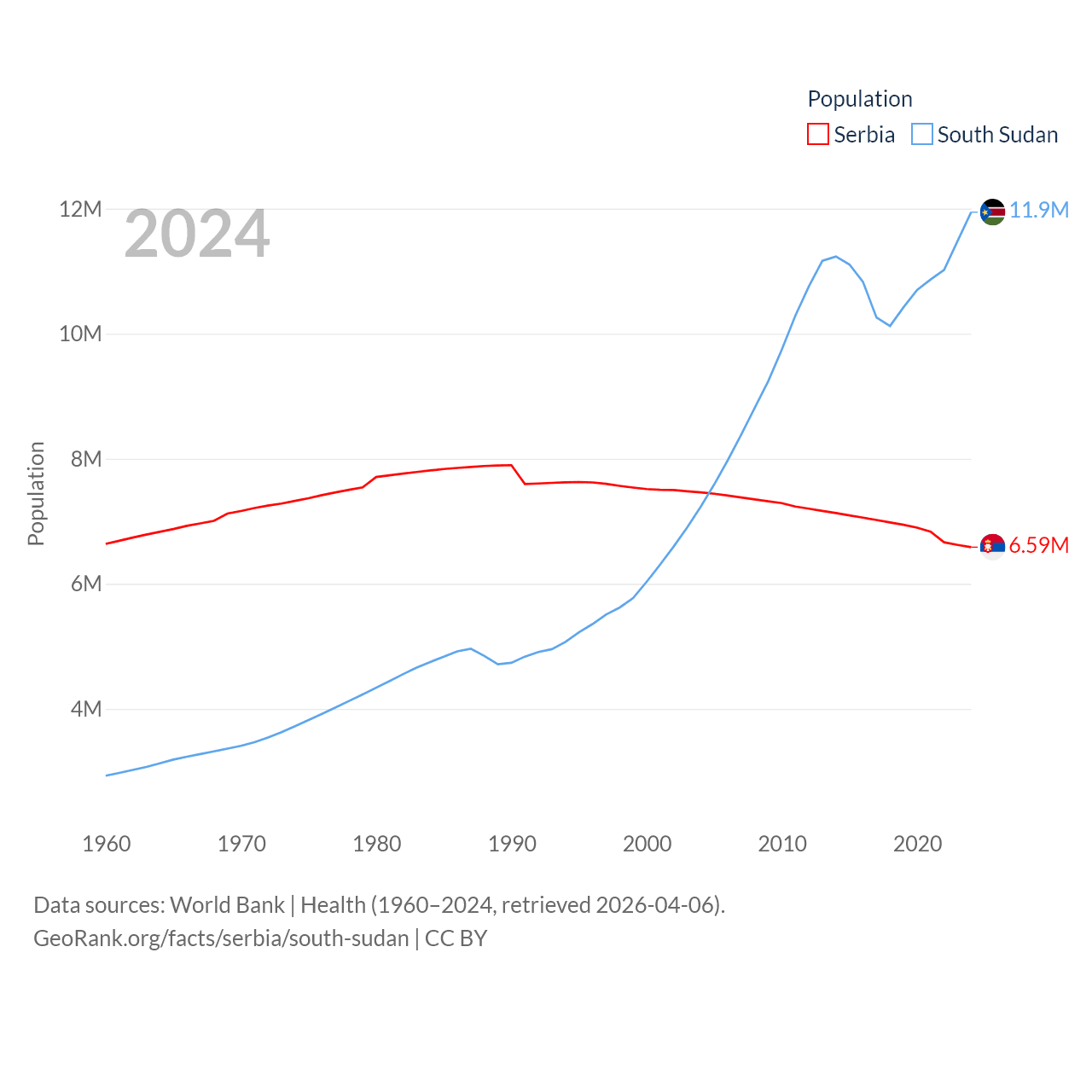 Serbia has a population of 6.59M (ranked 109/197), compared with 11.9M in South Sudan (ranked 81/197). Serbia's land area is 32,467 sq mi versus 243,990 sq mi for South Sudan (ranked 111th vs. 41st).