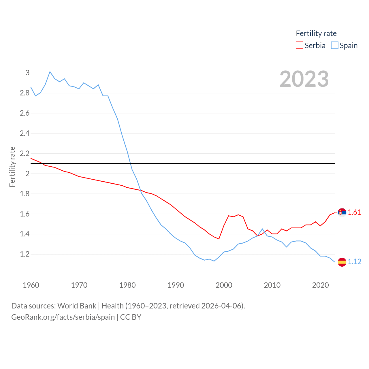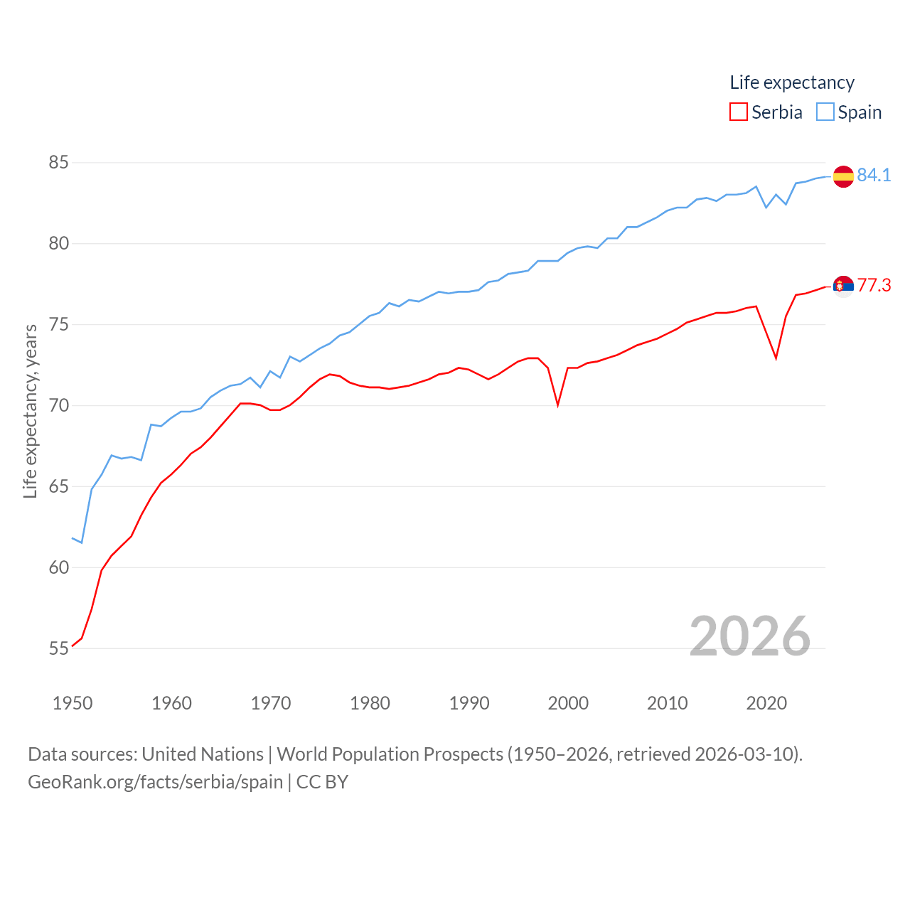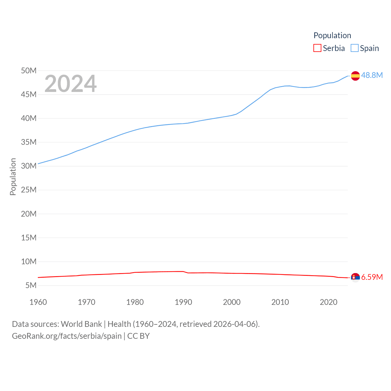 Serbia has a population of 6.59M (ranked 109/197), compared with 48.8M in Spain (ranked 32/197). Serbia's land area is 32,467 sq mi versus 192,934 sq mi for Spain (ranked 111th vs. 51st).