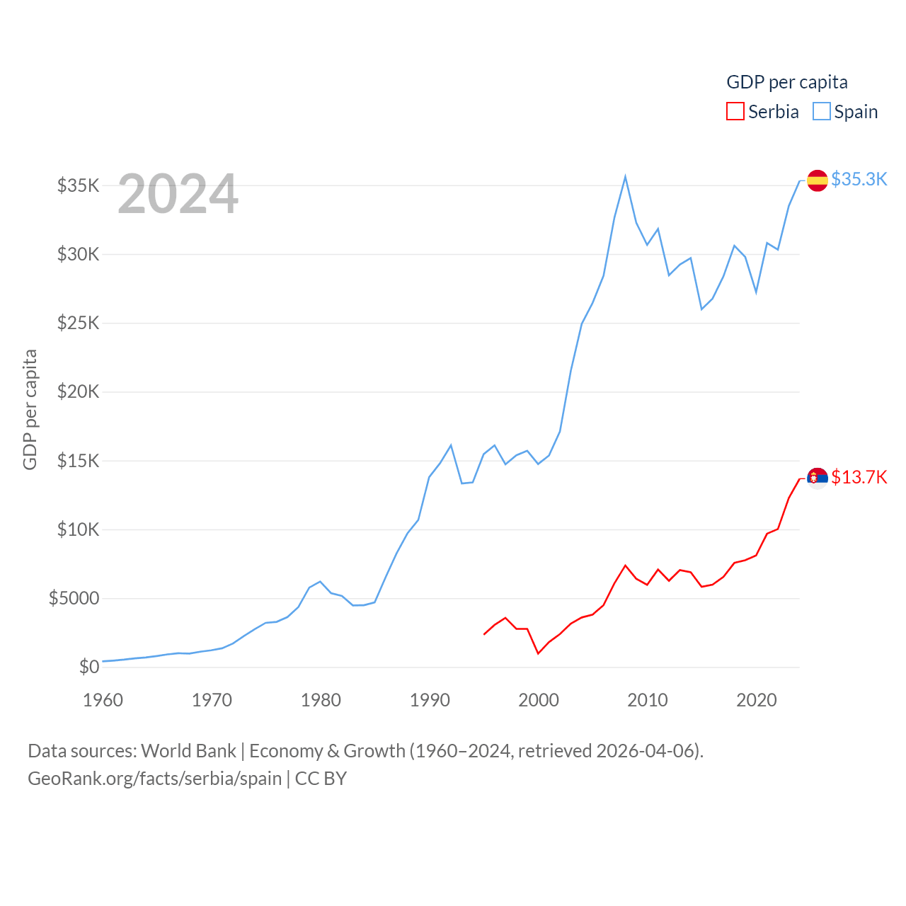 By GDP, Serbia ranks 76/197 ($90.1B) and Spain ranks 15/197 ($1.73T). By GDP per capita, Serbia ranks 73/197 ($13,679), while Spain ranks 32/197 ($35,327).