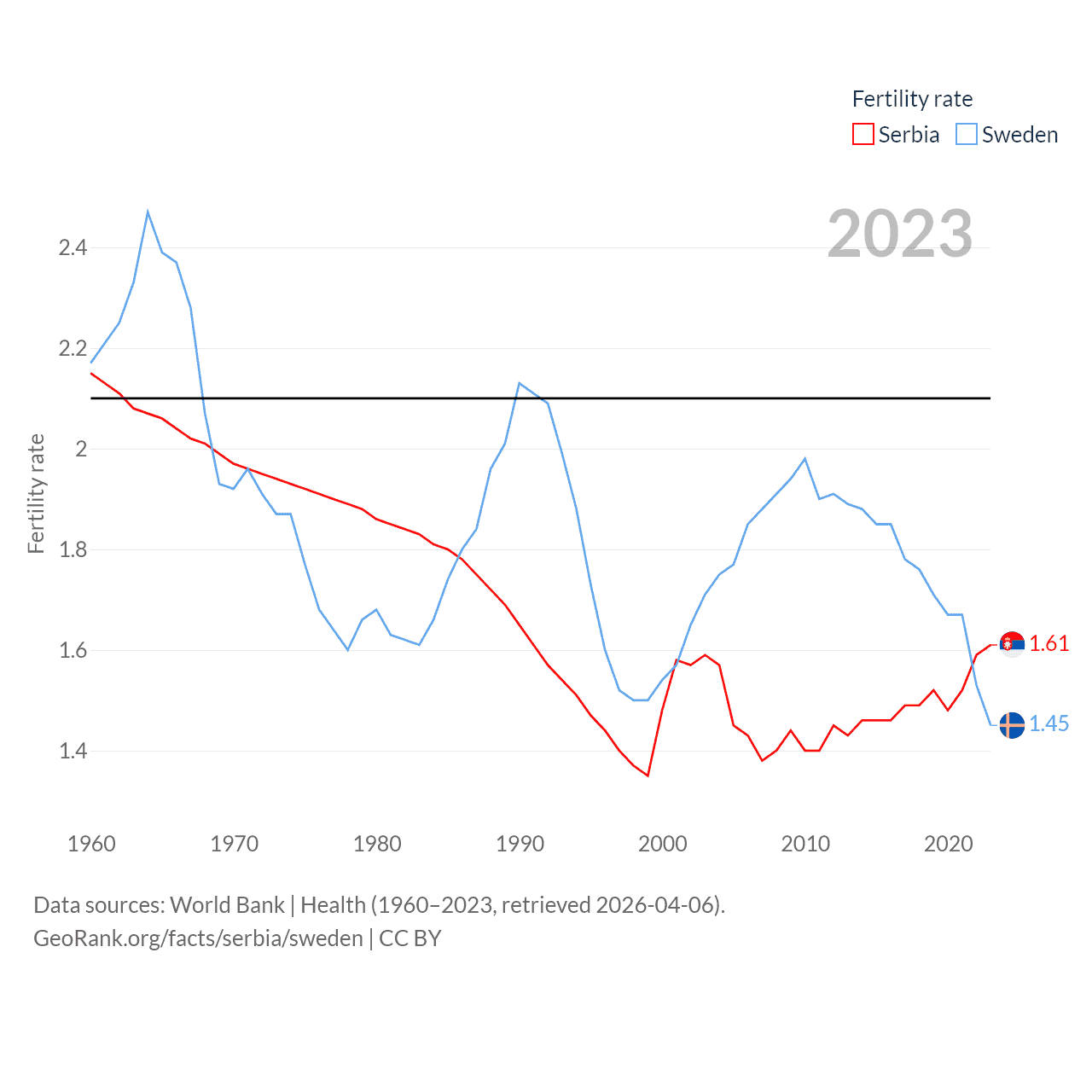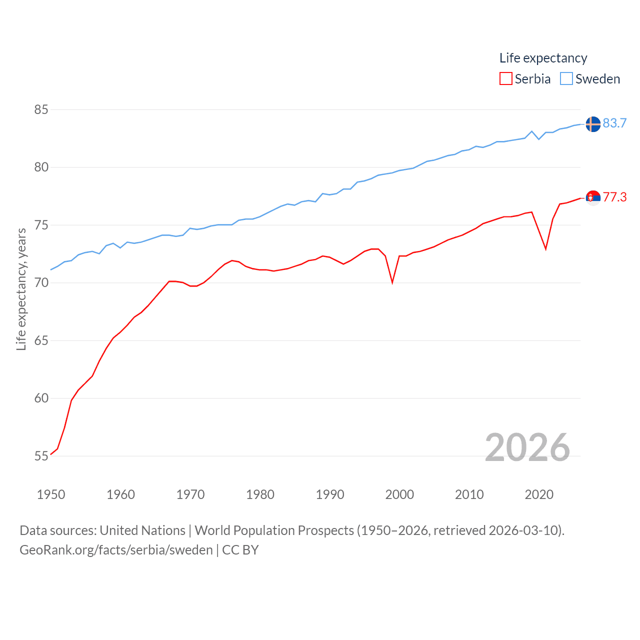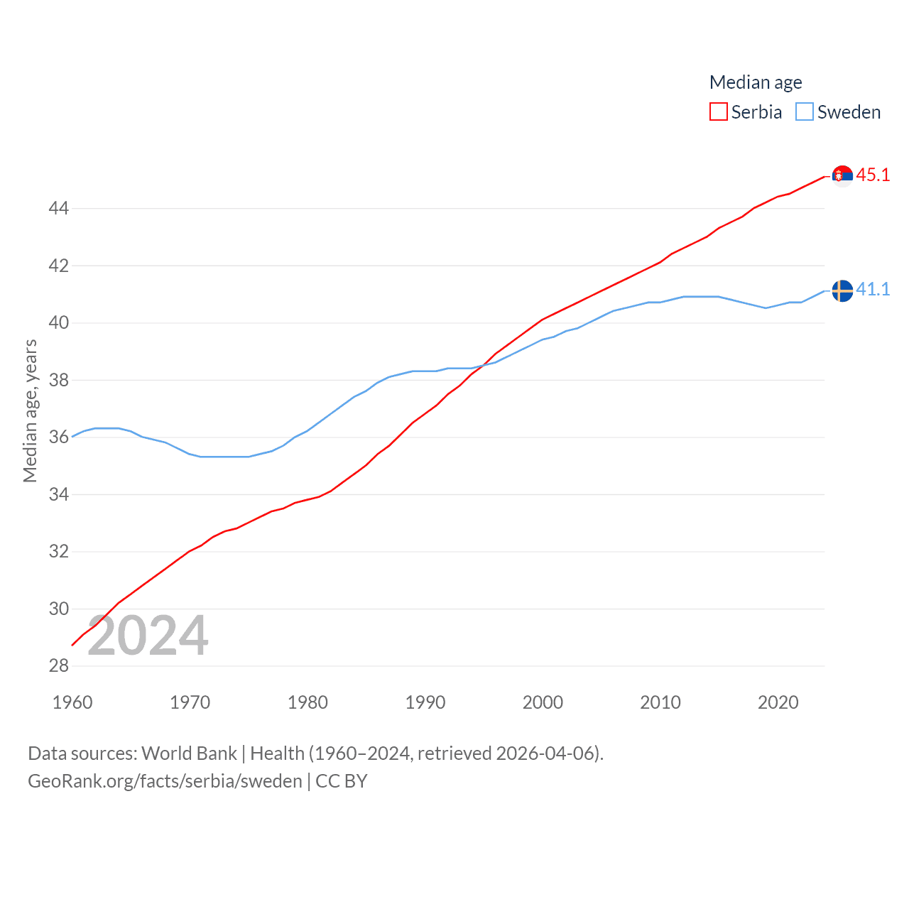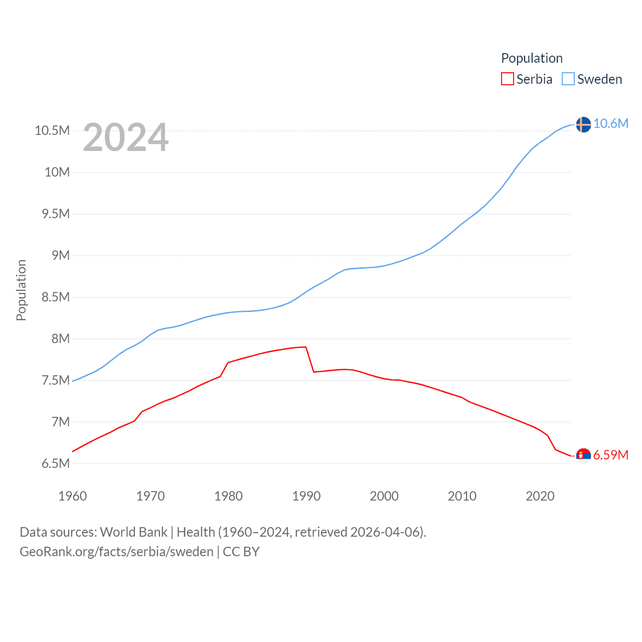 Serbia has a population of 6.59M (ranked 109/197), compared with 10.6M in Sweden (ranked 93/197). Serbia's land area is 32,467 sq mi versus 157,248 sq mi for Sweden (ranked 111th vs. 58th).