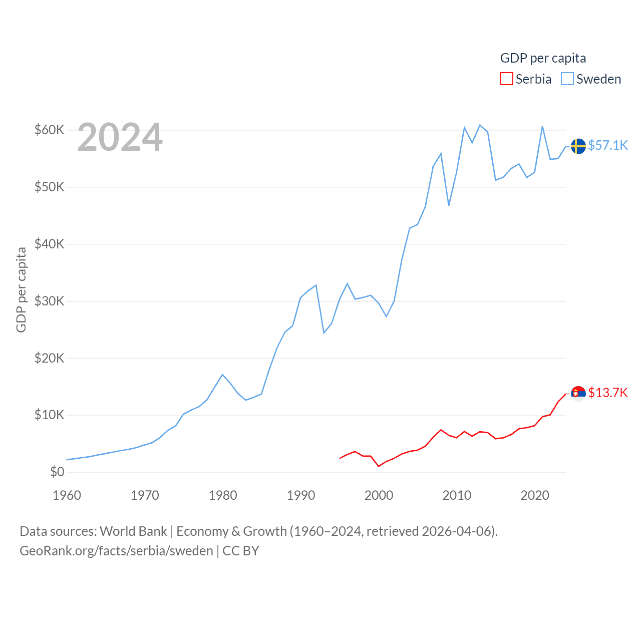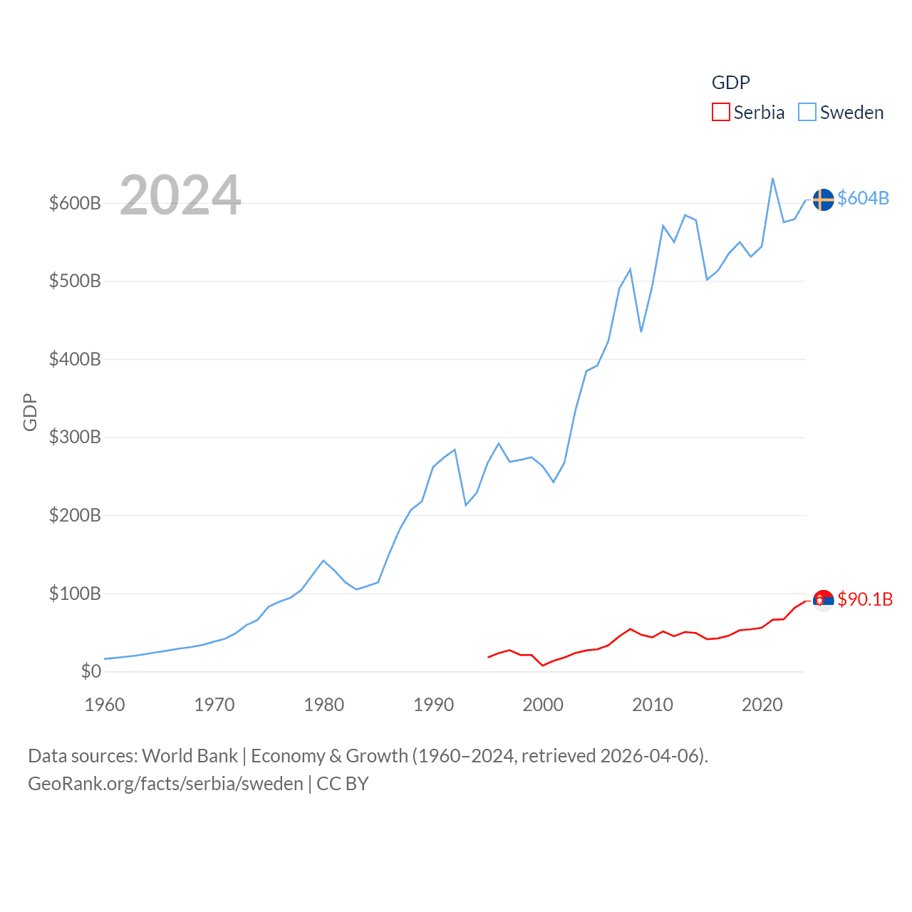 By GDP, Serbia ranks 76/197 ($90.1B) and Sweden ranks 26/197 ($604B). By GDP per capita, Serbia ranks 73/197 ($13,679), while Sweden ranks 17/197 ($57,117).