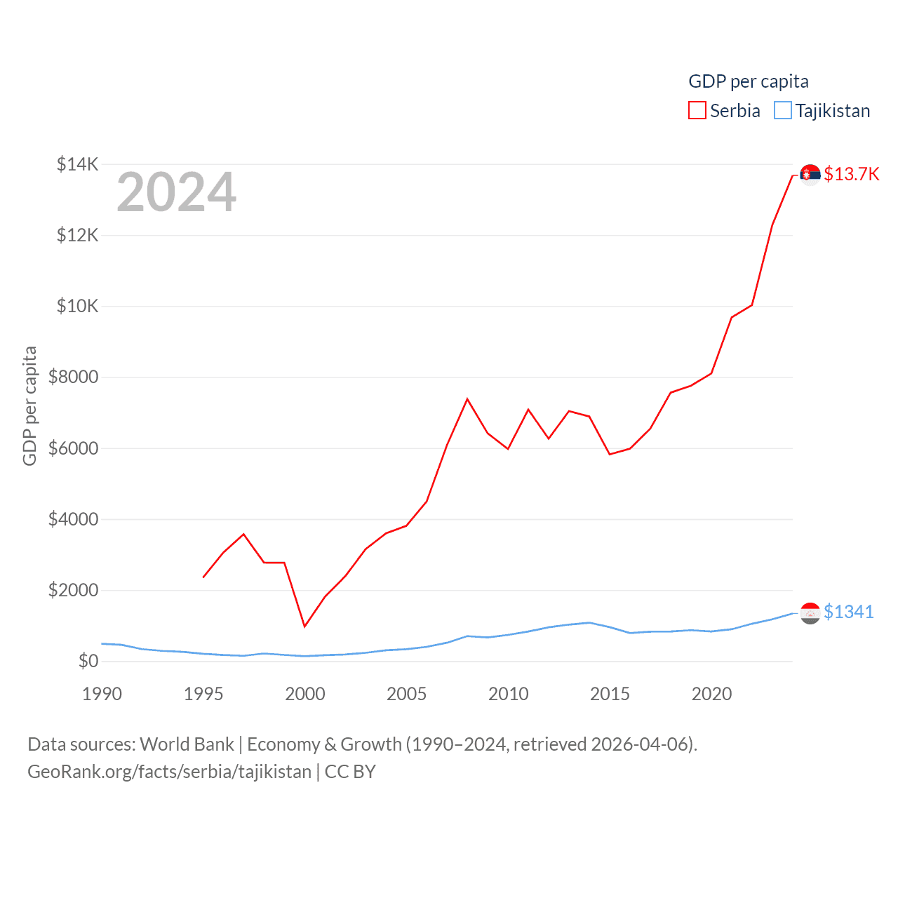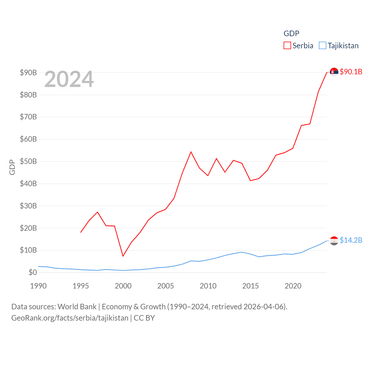 By GDP, Serbia ranks 76/197 ($90.1B) and Tajikistan ranks 145/197 ($14.2B). By GDP per capita, Serbia ranks 73/197 ($13,679), while Tajikistan ranks 166/197 ($1,341).